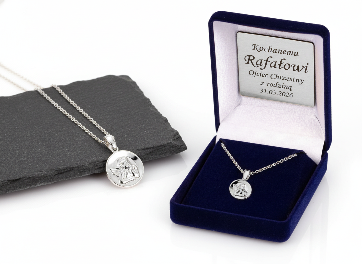 Zestaw obejmuje medalik i łańcuszek w eleganckim pudełku z możliwością wykonania dedykacji – trwałego graweru laserowego na metalowej tabliczce lub nadruku Ink-Jet na wieku. Możesz dodać imię dziecka, datę Chrztu lub cytat modlitewny, aby podarunek stał się wyjątkową pamiątką duchową.