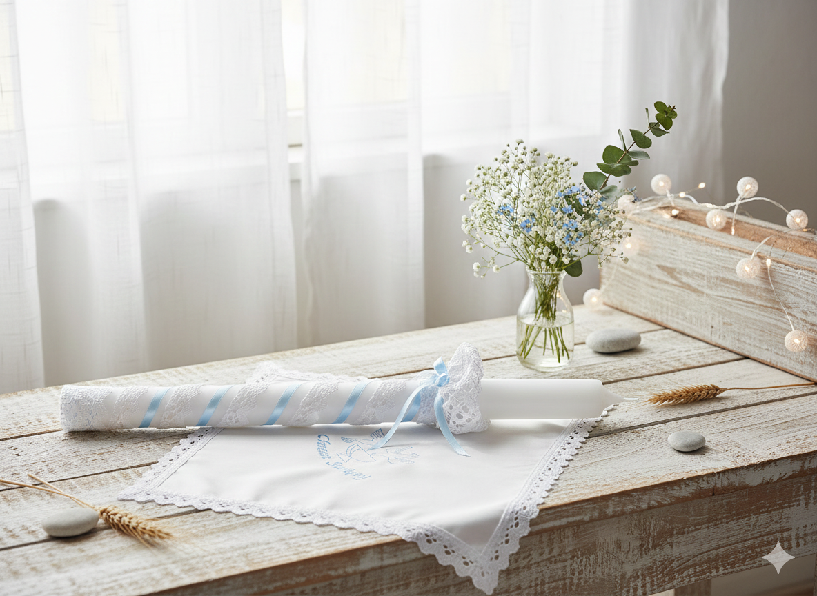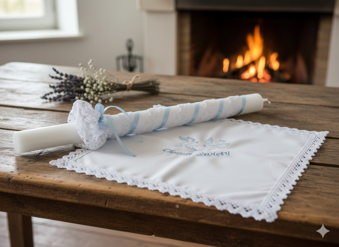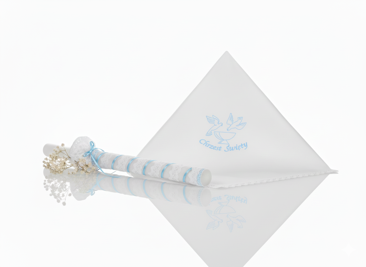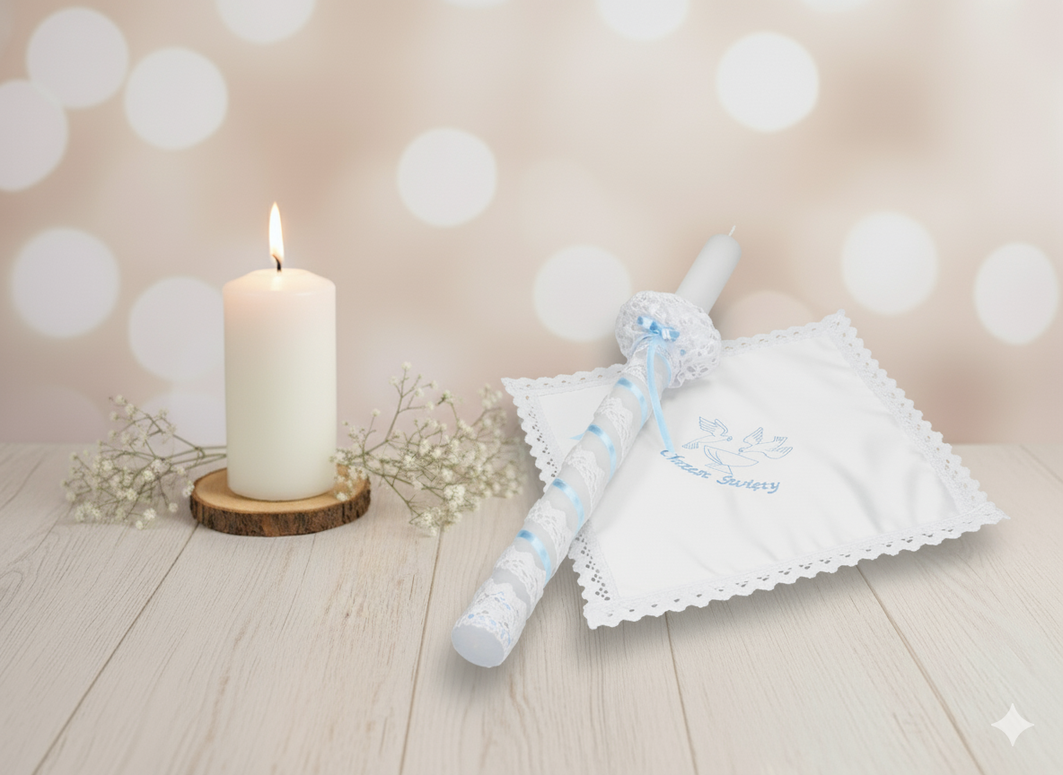 - Świeca chrzcielna – klasyczna biała świeca ozdobiona delikatnymi błękitnymi akcentami, symbolizująca światło wiary i czystość serca.