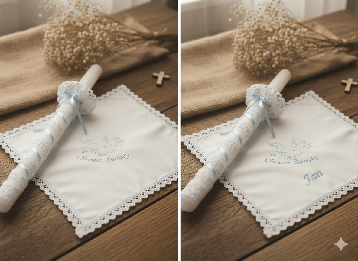 - Pełny komplet – świeca i szatka gotowe na dzień Chrztu.