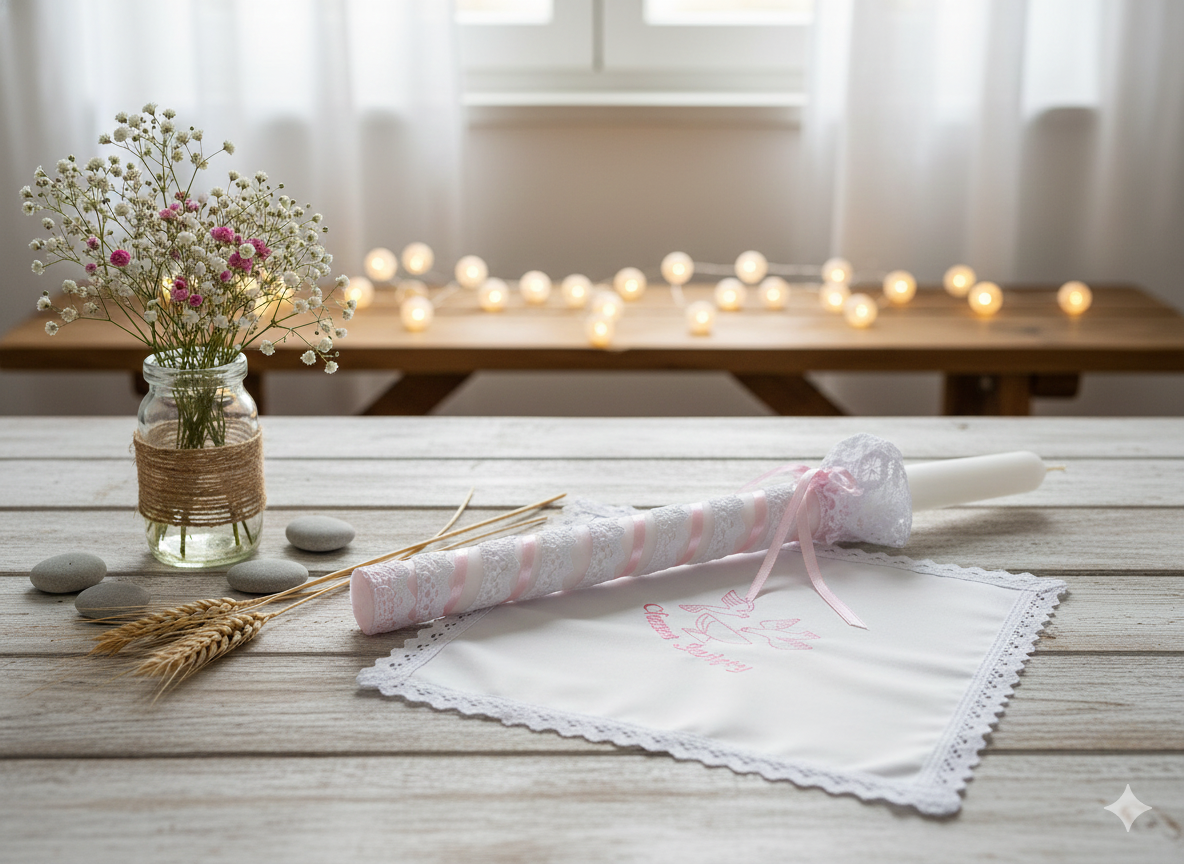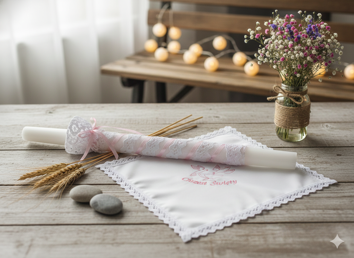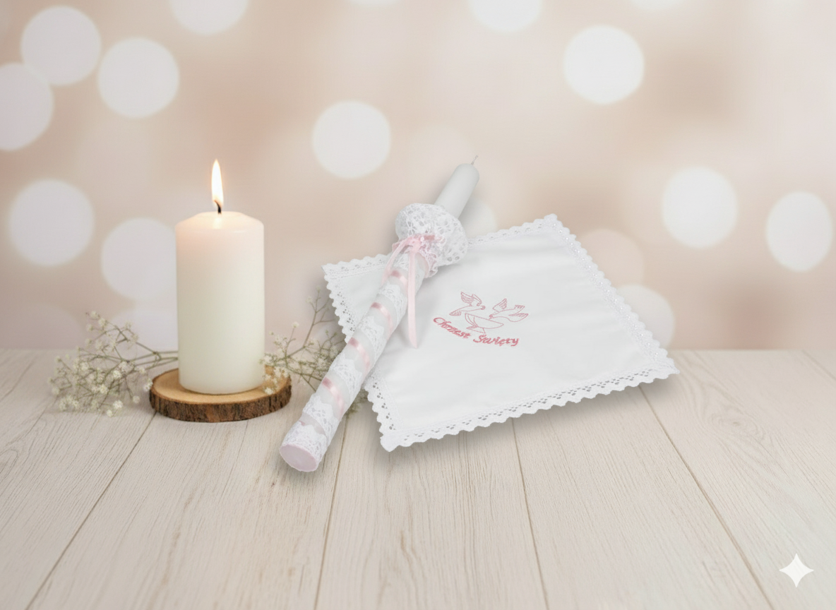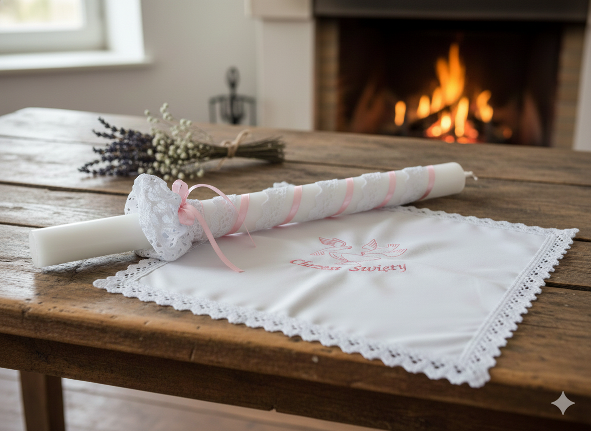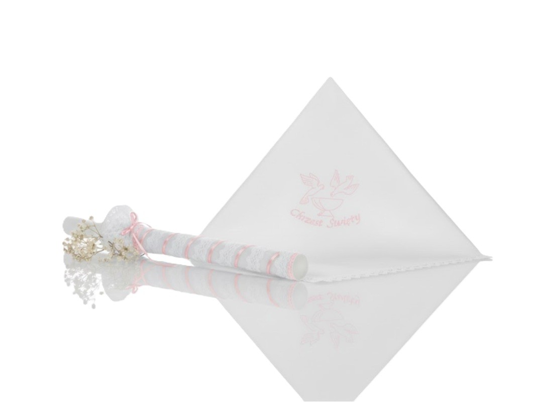 - Świeca chrzcielna – biała, ozdobiona subtelnymi różowymi detalami, symbolizująca światło wiary i czystość serca.