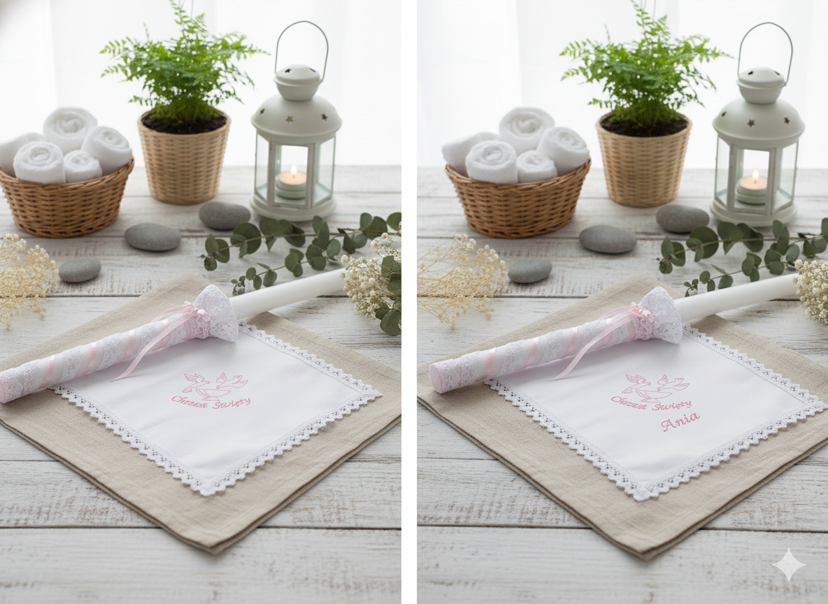 Na życzenie wykonujemy haft personalizowany na szatce – imię dziecka oraz datę uroczystości. Możliwa jest również personalizacja świecy metodą druku cyfrowego na drewnianym serduszku. Warianty personalizacji dostępne są w opcji wyboru. Dzięki temu zestaw staje się unikalną, osobistą pamiątką Chrztu Świętego.