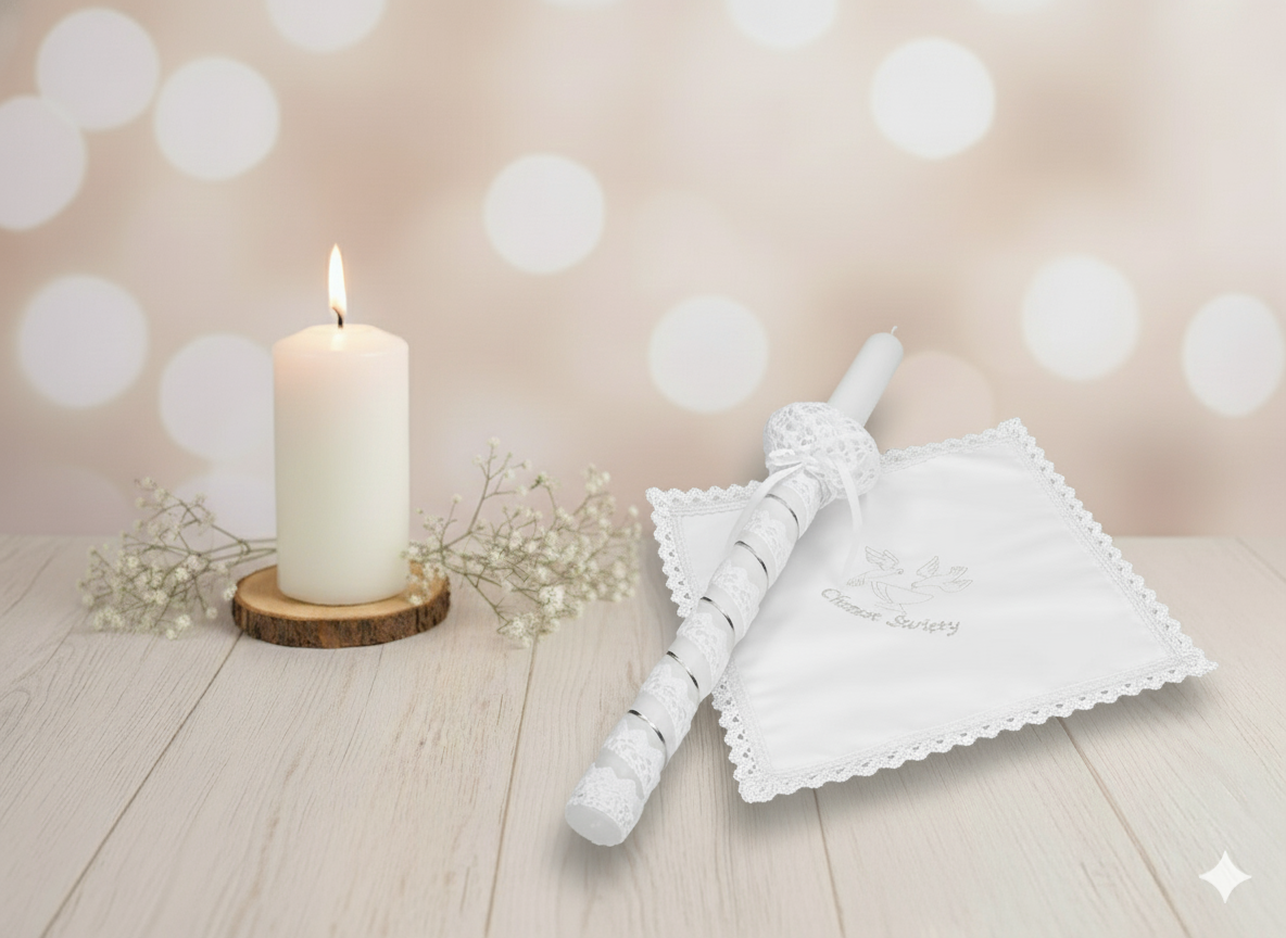- Kompletny zestaw – świeca i szatka gotowe do ceremonii Chrztu Świętego.