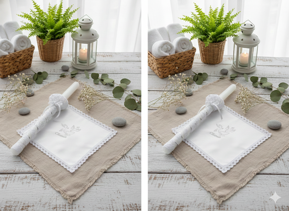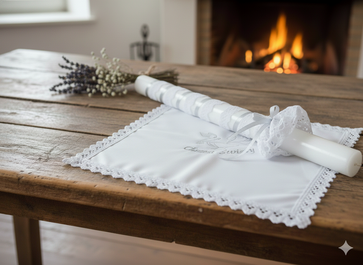 - Świeca chrzcielna – klasyczna, biała świeca ozdobiona delikatnymi srebrnymi detalami, symbolizującymi światło wiary i Bożą obecność.