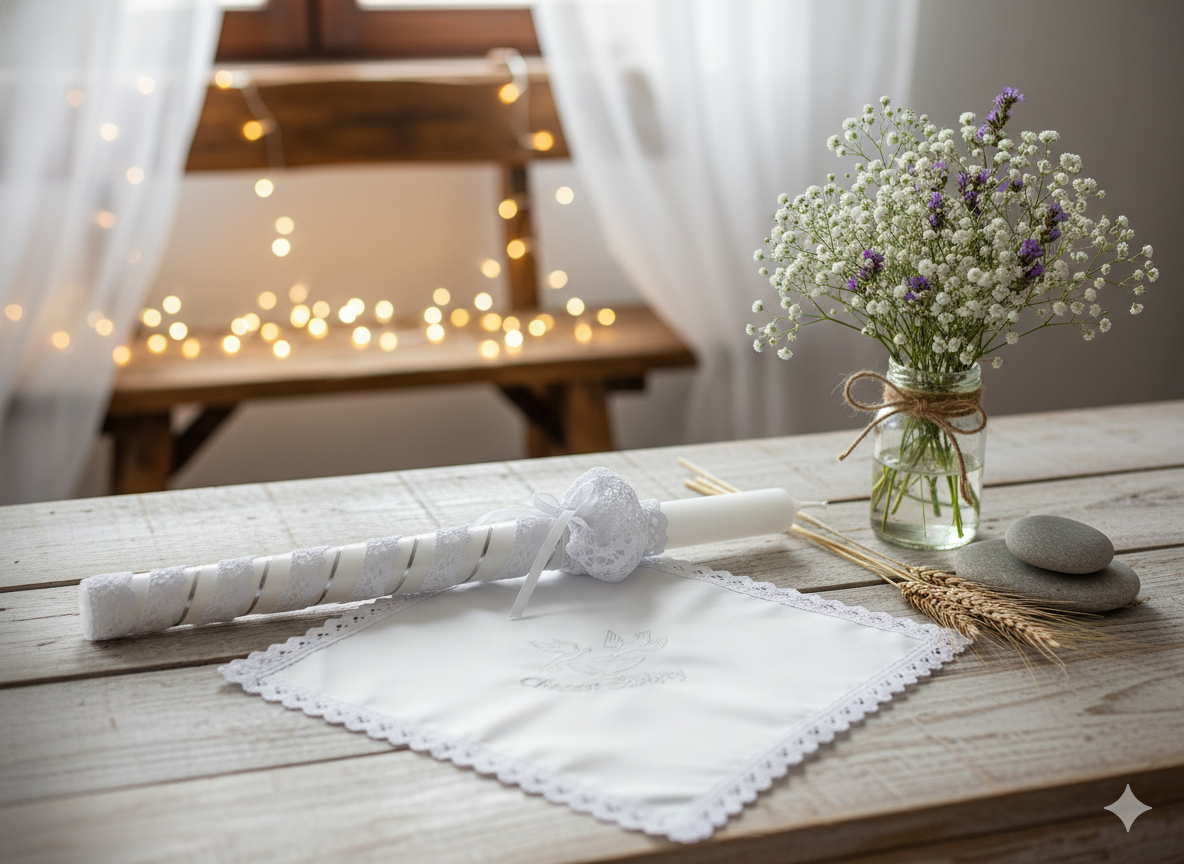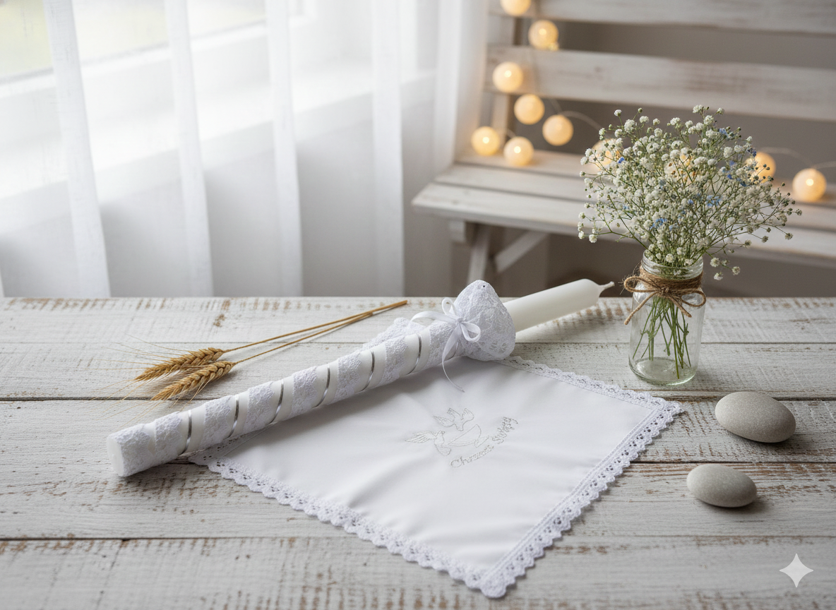 Stylowy zestaw do Chrztu: świeca i szatka z białą koronką bawełnianą. Elegancka oprawa sakramentu, idealny komplet dla dziecka i rodziny.