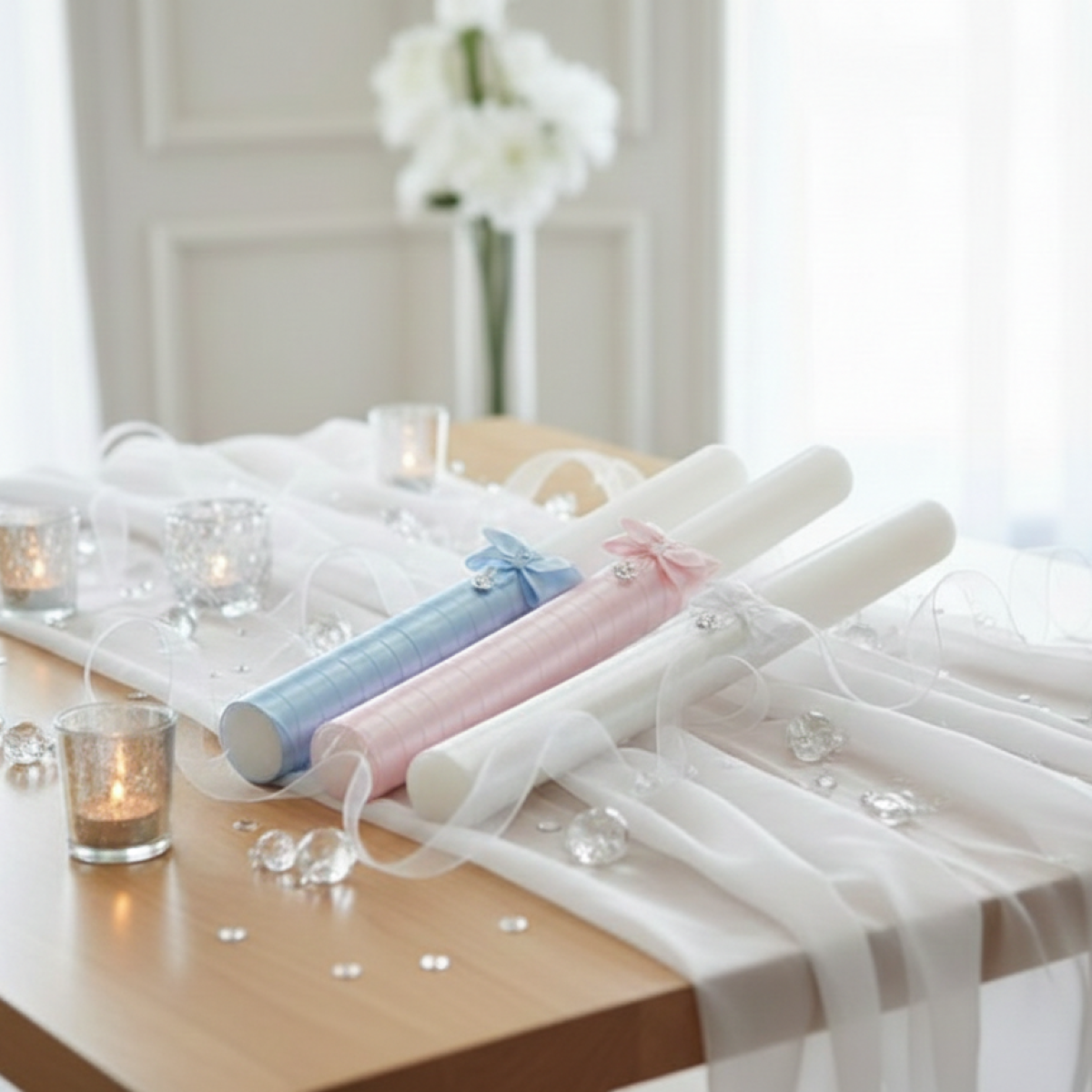 Świeca dostępna jest w trzech kolorach: białym, różowym oraz niebieskim, co pozwala dopasować ją do charakteru uroczystości oraz indywidualnych preferencji. Wykonana z wysokiej jakości wosku, pali się czysto, spokojnie i równomiernie.