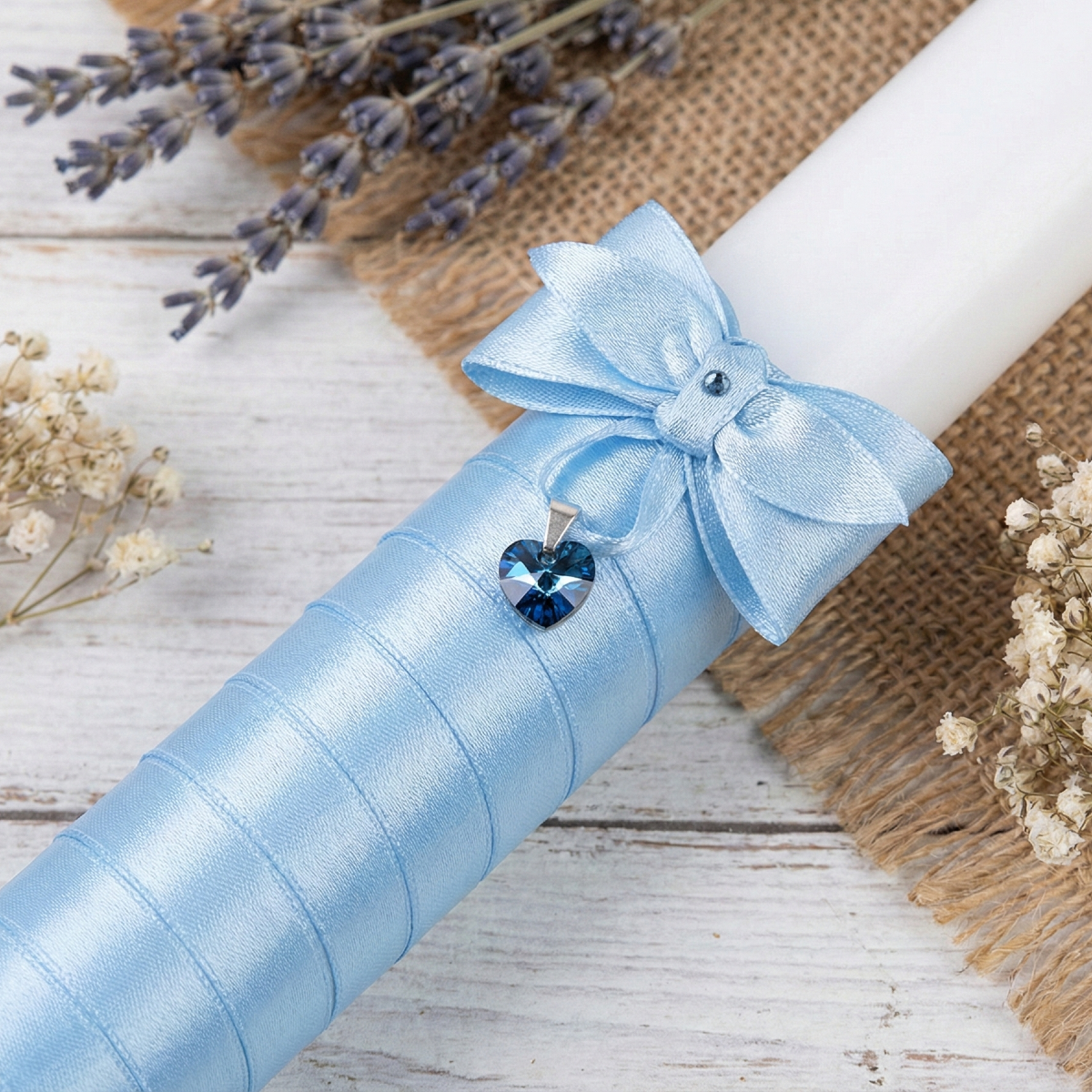 Świeca „Crystal Light – Satyna” to elegancka gromnica ozdobiona satynową wstęgą i ręcznie umieszczonym kryształkiem Preciosa®. Symbolizuje światło, czystość i duchową harmonię, będąc doskonałym wyborem zarówno na Chrzest Święty, jak i Komunię. Dostępna w trzech kolorach – białym, różowym i niebieskim – zachwyca subtelnym połyskiem i uroczystym charakterem.