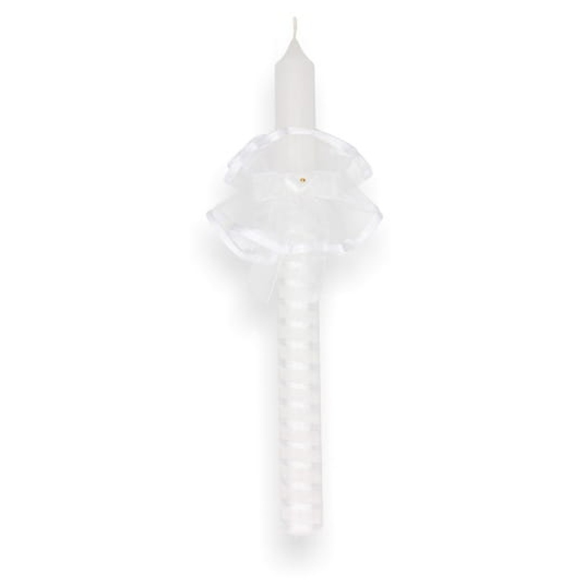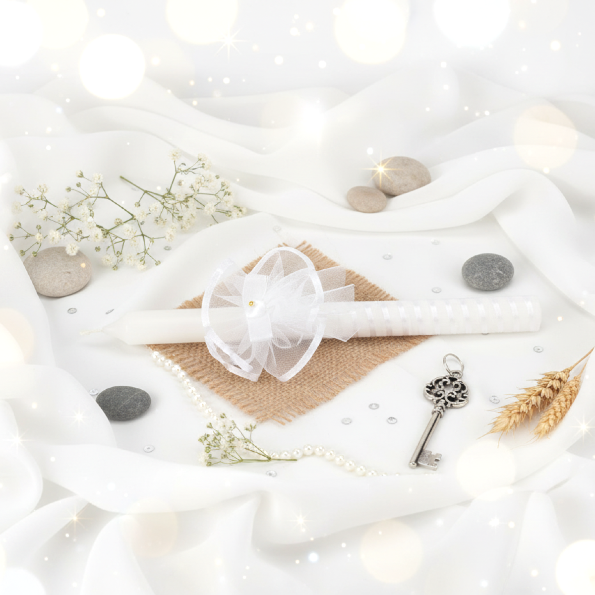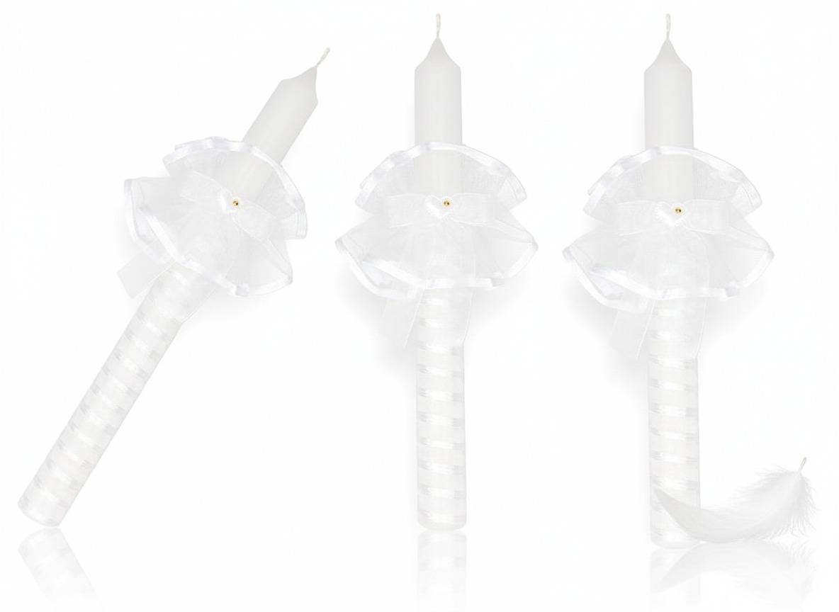 Świeca gromniczna z kolekcji AMAZON® SZYFON, zdobiona delikatnym stroikiem z szyfonowej wstążki w odcieniach bieli i pasteli. Elegancka, ręcznie wykonana pamiątka Chrztu Świętego – symbol wiary, czystości i błogosławieństwa.