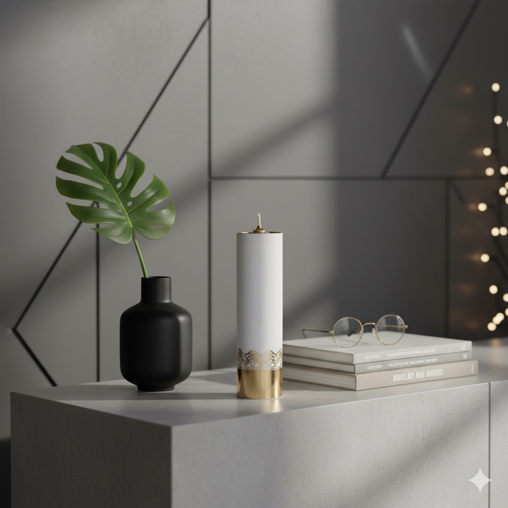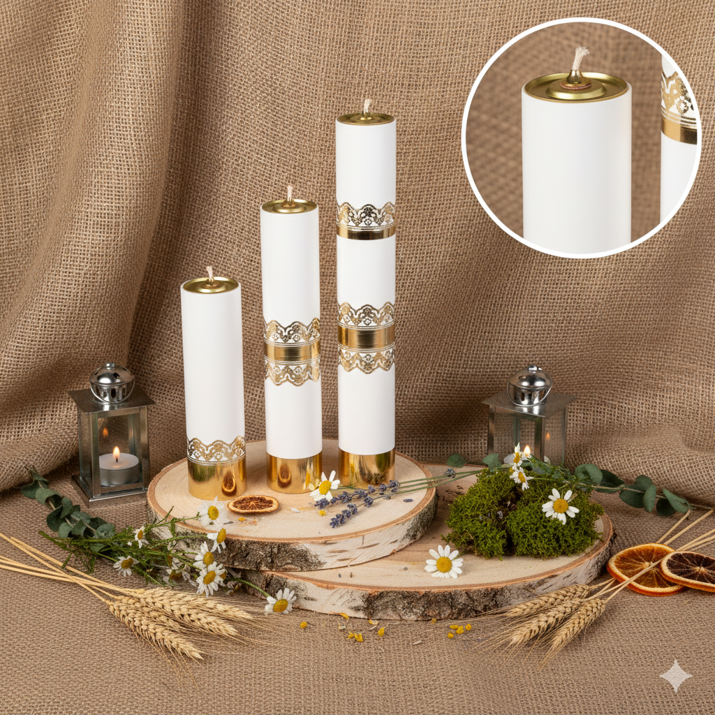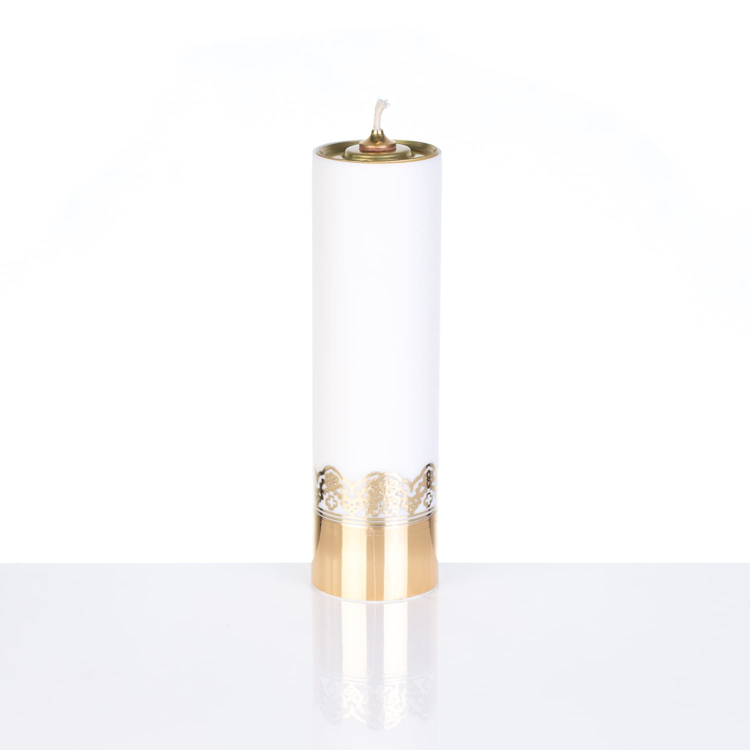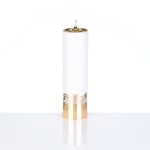 Kompaktowa świeca olejowa liturgiczna o wysokości 22 cm – biała ze złotym zdobieniem.