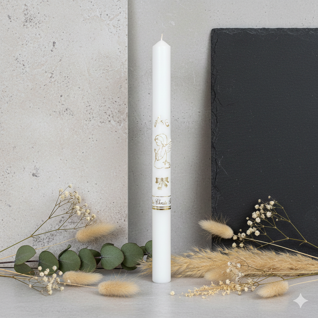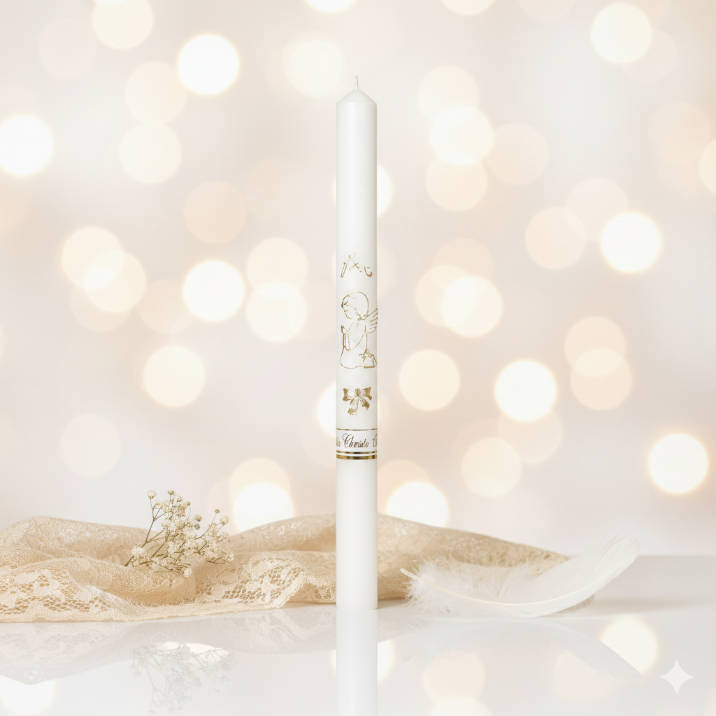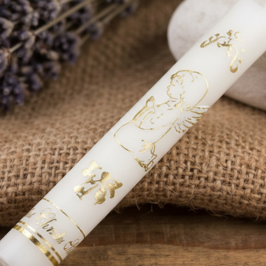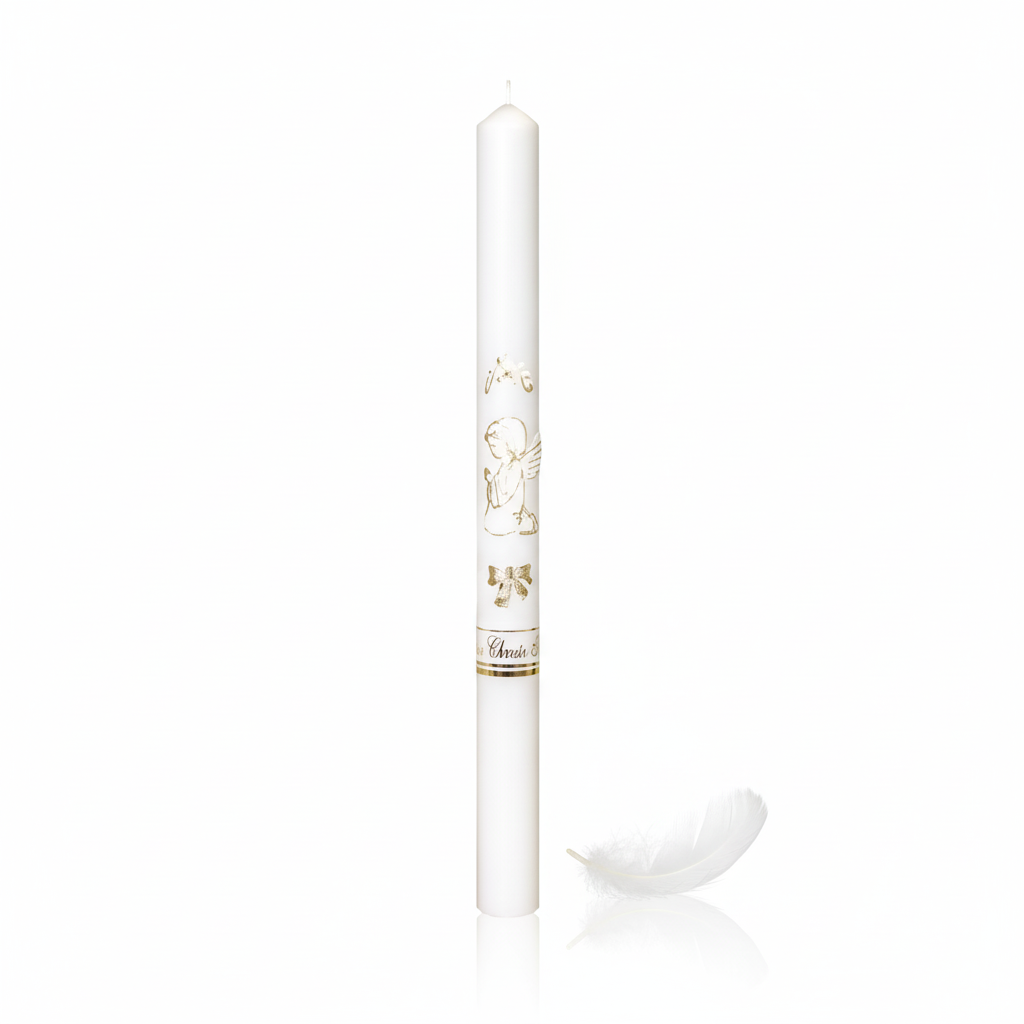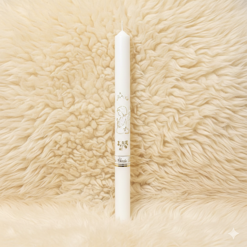 Klasyczna świeca na Chrzest Święty z aniołkiem to jeden z najważniejszych znaków sakramentu. Zapalana podczas ceremonii symbolizuje światło wiary, nowe życie w Chrystusie oraz włączenie dziecka do wspólnoty Kościoła.