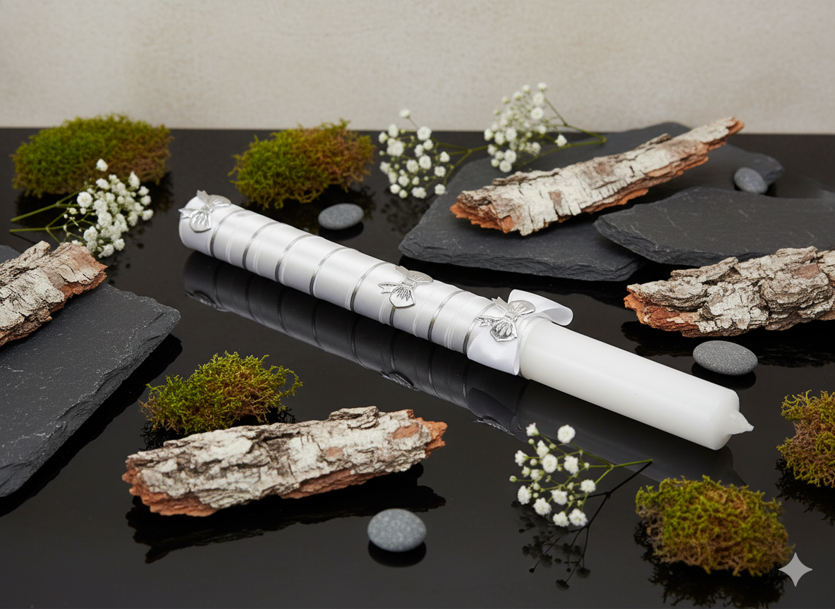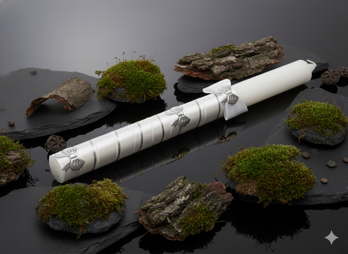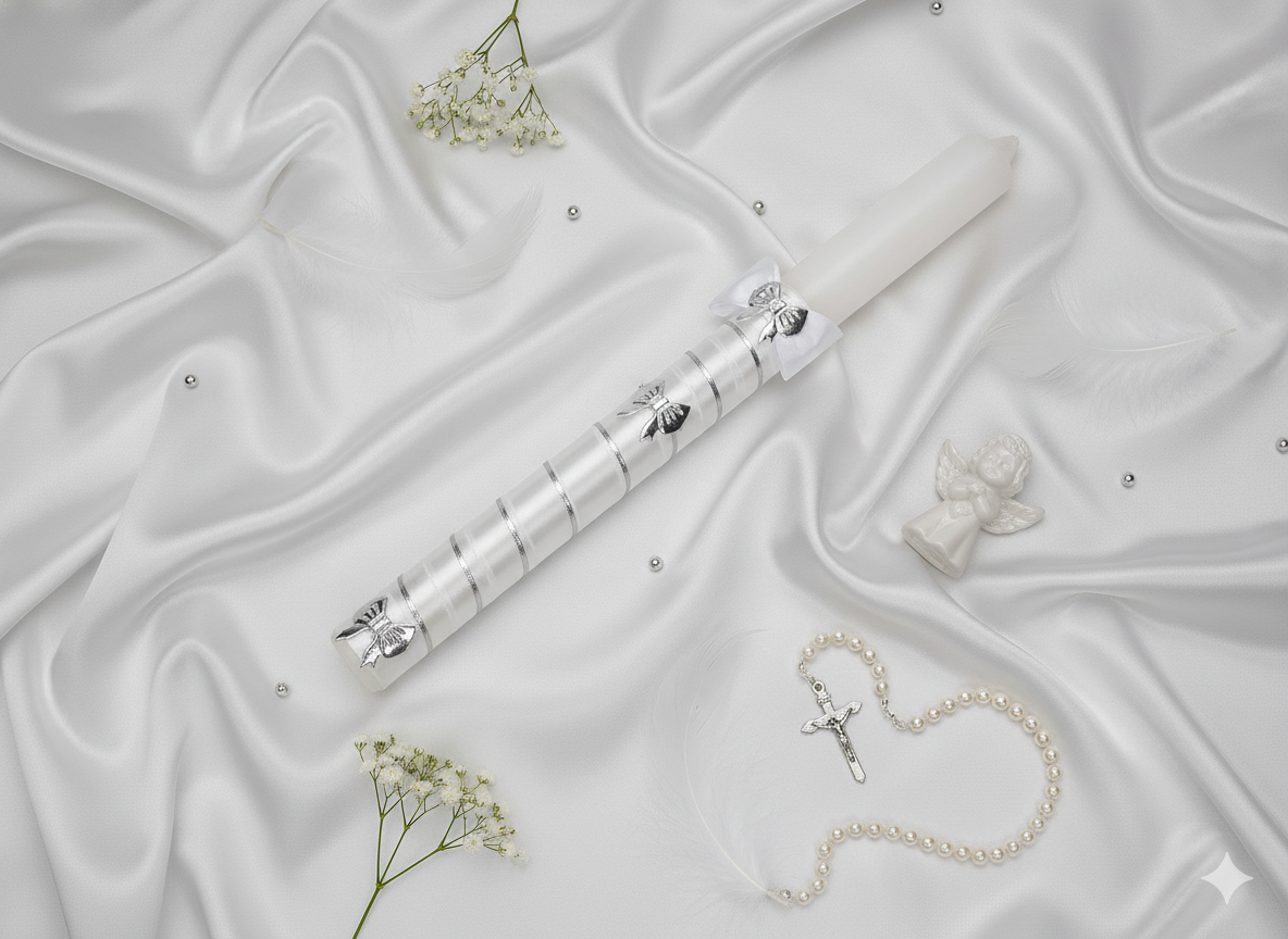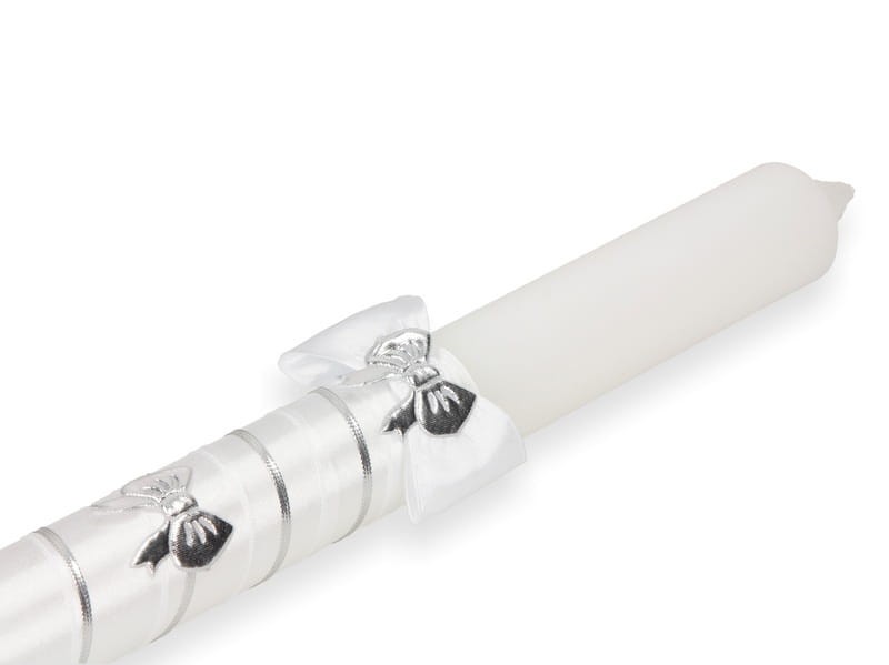 Świeca chrzcielna jest symbolem światła i obecności Chrystusa, które od momentu Chrztu Świętego prowadzi dziecko przez całe życie. Model „Srebrna Atlas” łączy duchową głębię sakramentu z elegancją i szlachetnością formy. Srebrne zdobienia oraz połyskujący atlasowy materiał podkreślają uroczysty charakter ceremonii i wyjątkowość tego dnia.