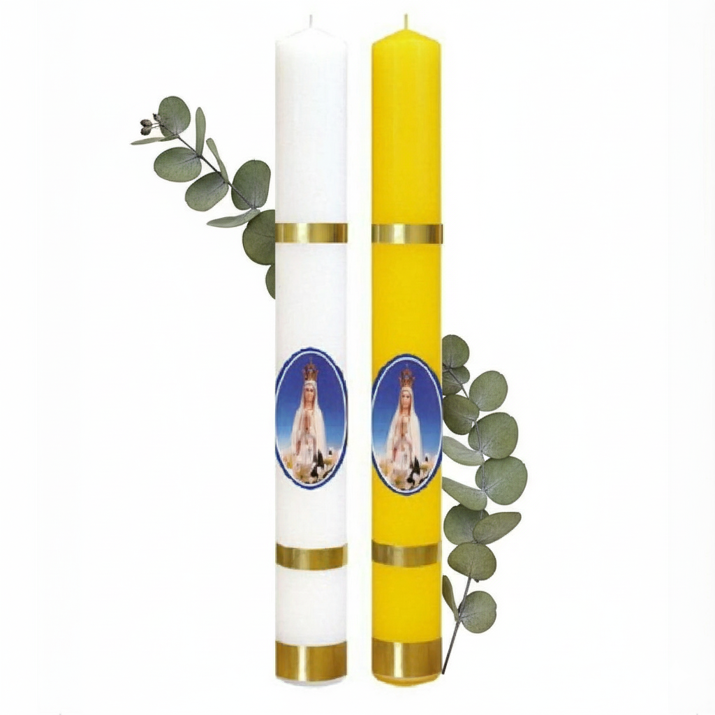 Elegancka świeca gromniczna z wizerunkiem Matki Boskiej Fatimskiej o wysokości 30 cm i średnicy 25 mm. Tradycyjny symbol ochrony, światła i wiary – doskonała na Święto Matki Bożej Gromnicznej (2 lutego) oraz jako pamiątka religijna.