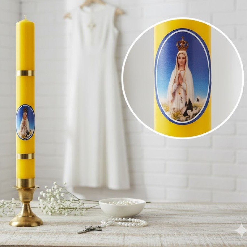 Jej blask symbolizuje Bożą opiekę, ochronę przed złem oraz wiarę rozświetlającą codzienne życie. Obecność wizerunku Matki Boskiej Fatimskiej nadaje świecy dodatkowy wymiar modlitwy, pokoju i zawierzenia Maryi.