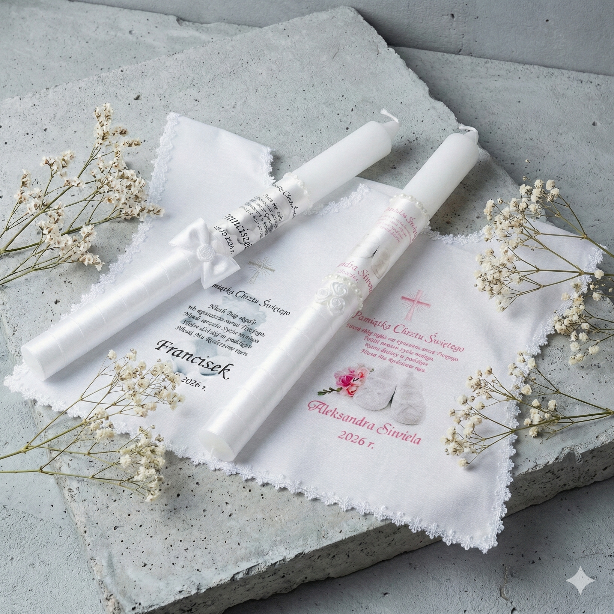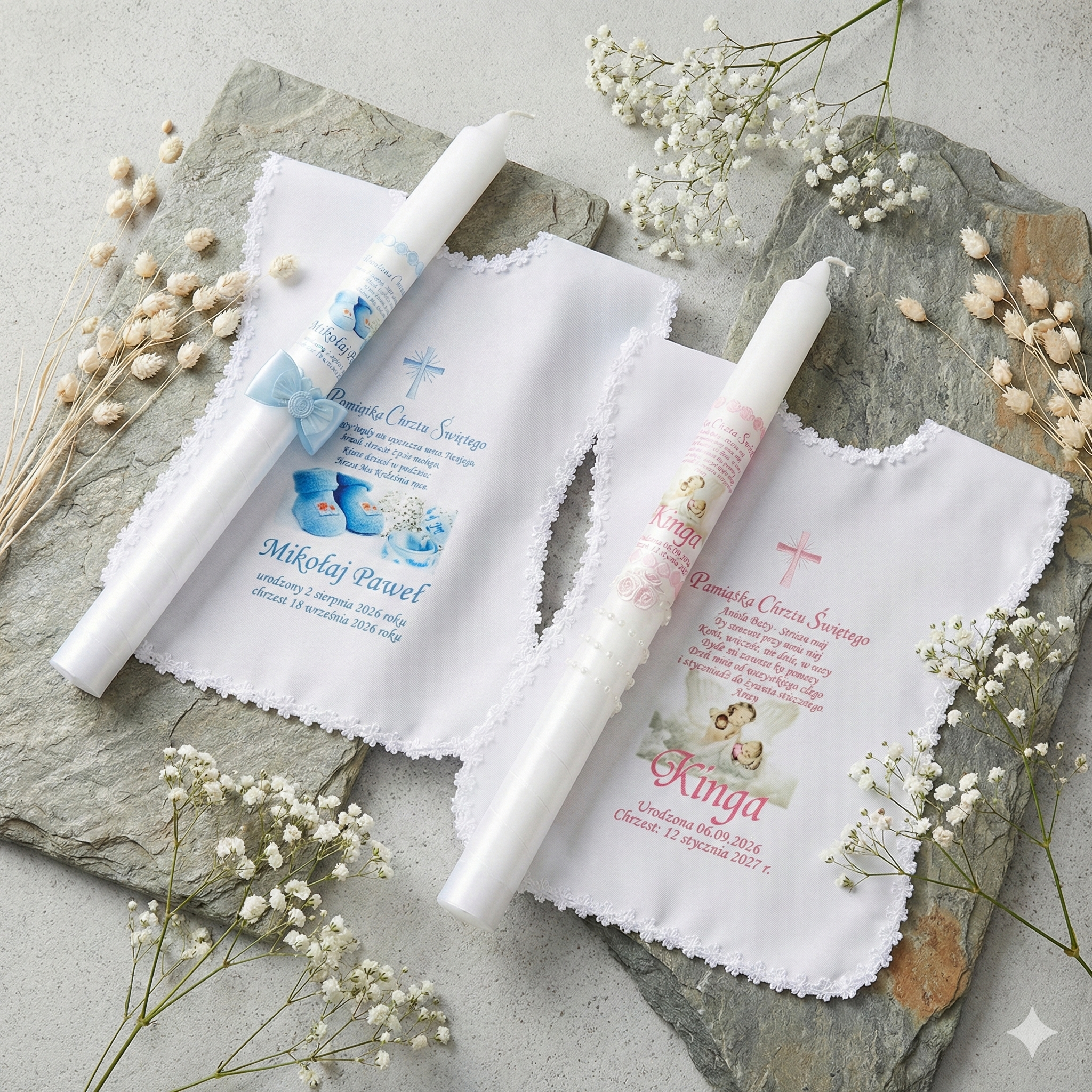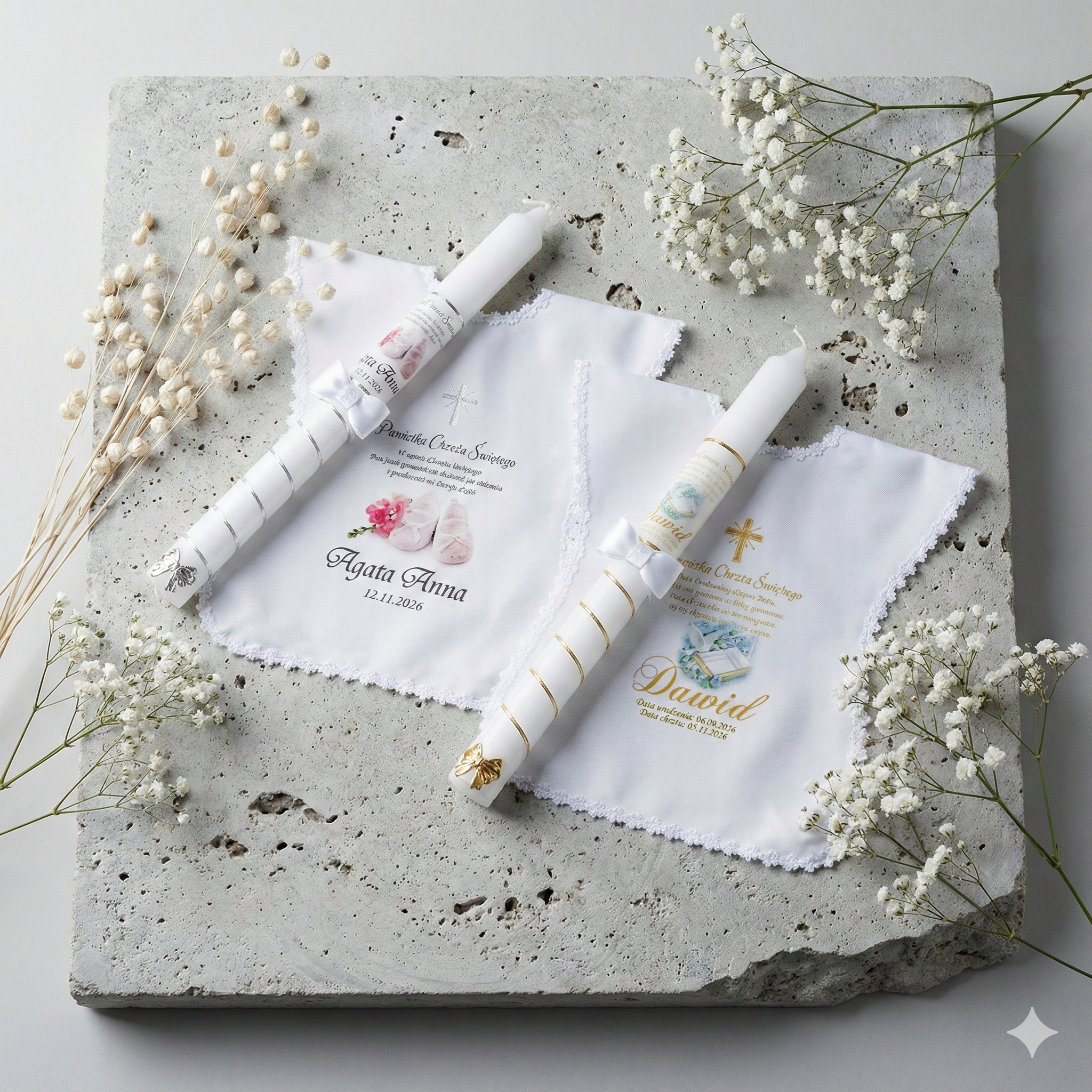 Zestaw można w pełni spersonalizować – nadruk imienia dziecka, daty Chrztu Świętego oraz wybranego wiersza, modlitwy lub cytatu sprawia, że każda szatka i świeca stają się jedyną w swoim rodzaju pamiątką o głębokim, osobistym znaczeniu.