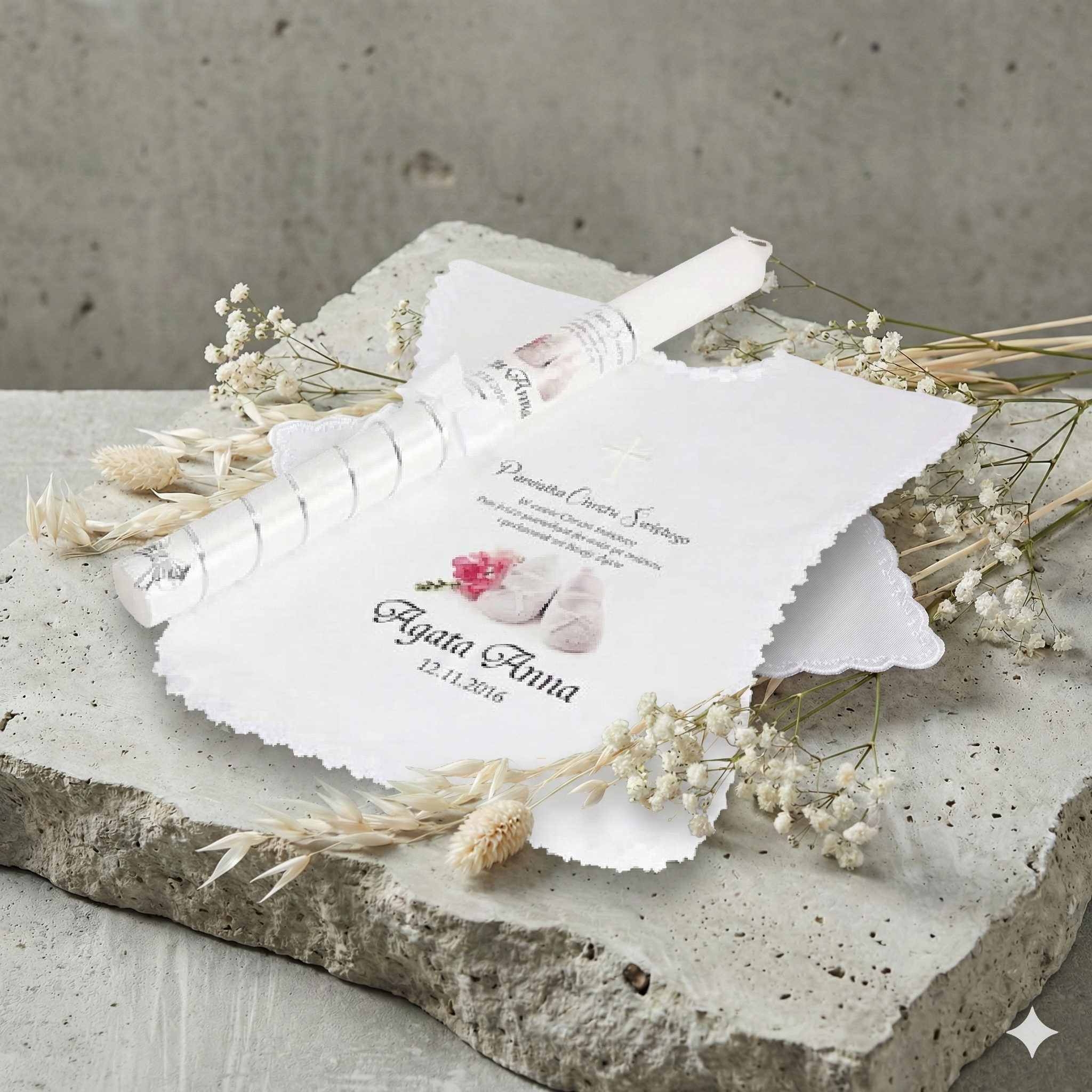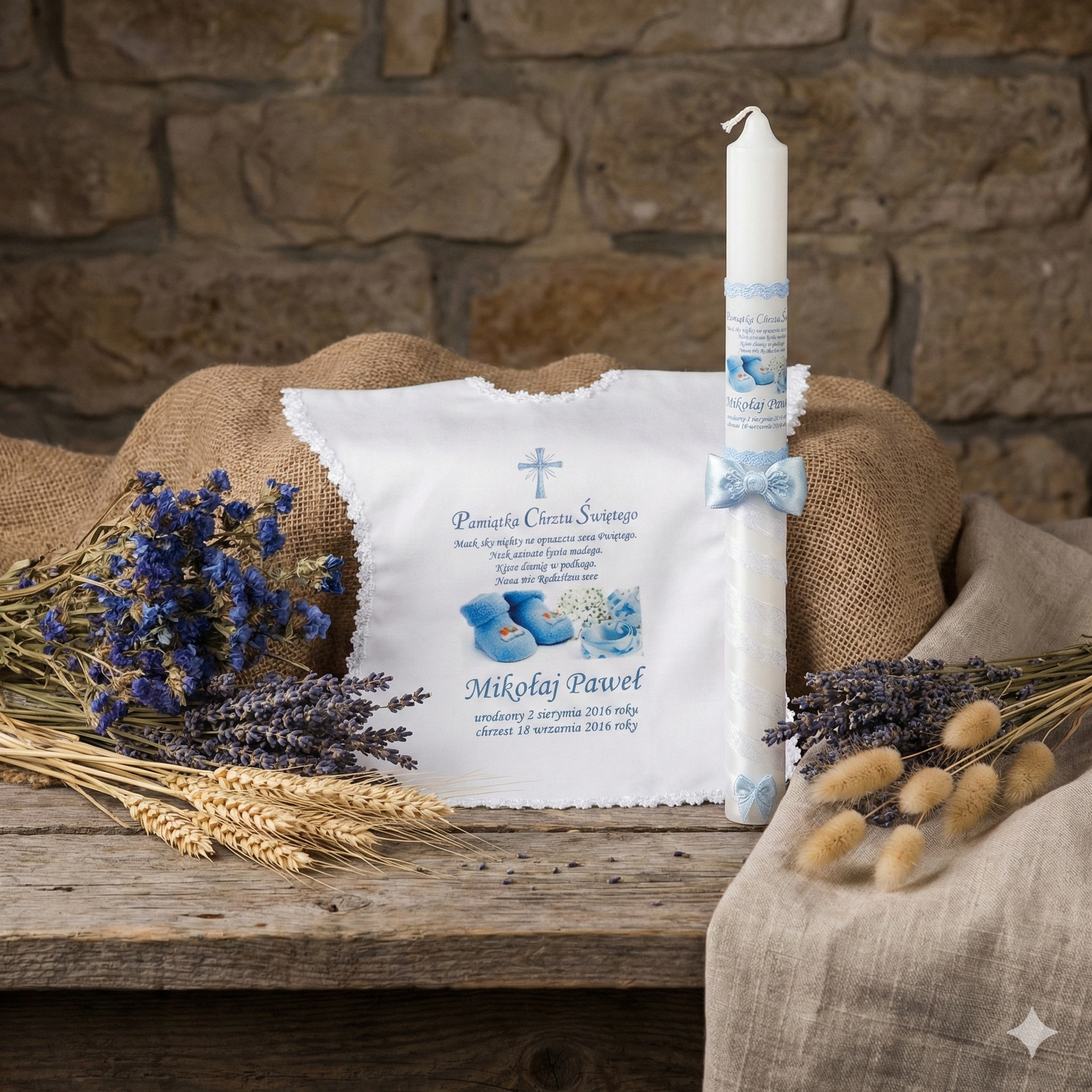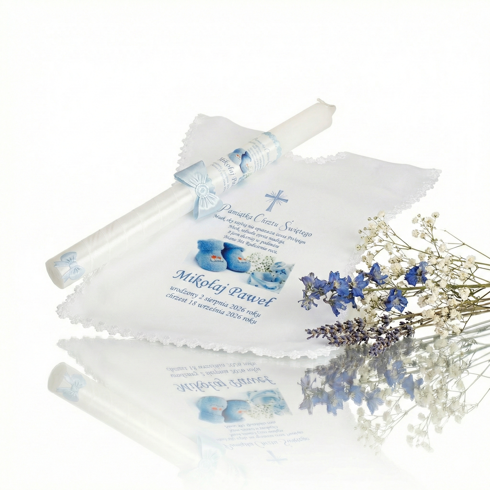 Zestaw można w pełni spersonalizować – nadruk imienia dziecka, daty Chrztu Świętego oraz wybranego wiersza, modlitwy lub cytatu sprawia, że każda szatka i świeca stają się jedyną w swoim rodzaju pamiątką o głębokim, osobistym znaczeniu.