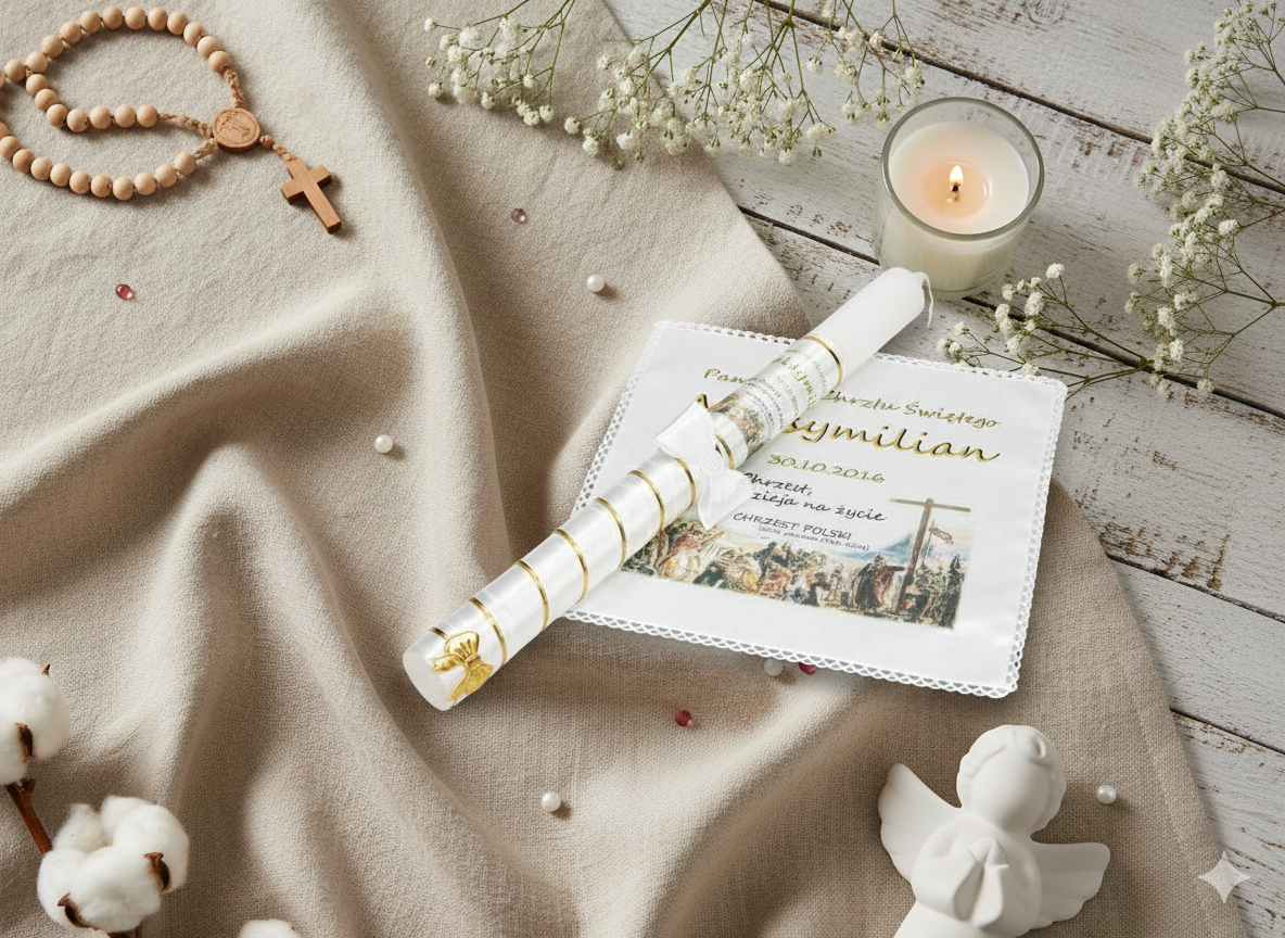 Zestaw jubileuszowy „Światło Pamięci – Chrzest Polski” to wyjątkowa pamiątka nawiązująca do historycznego momentu przyjęcia chrztu przez Mieszka I w 966 roku. Ręcznie zdobiona świeca z medalikiem i szatka z nadrukiem jubileuszowym tworzą symboliczny komplet, który łączy duchowe odrodzenie z narodową tradycją wiary.