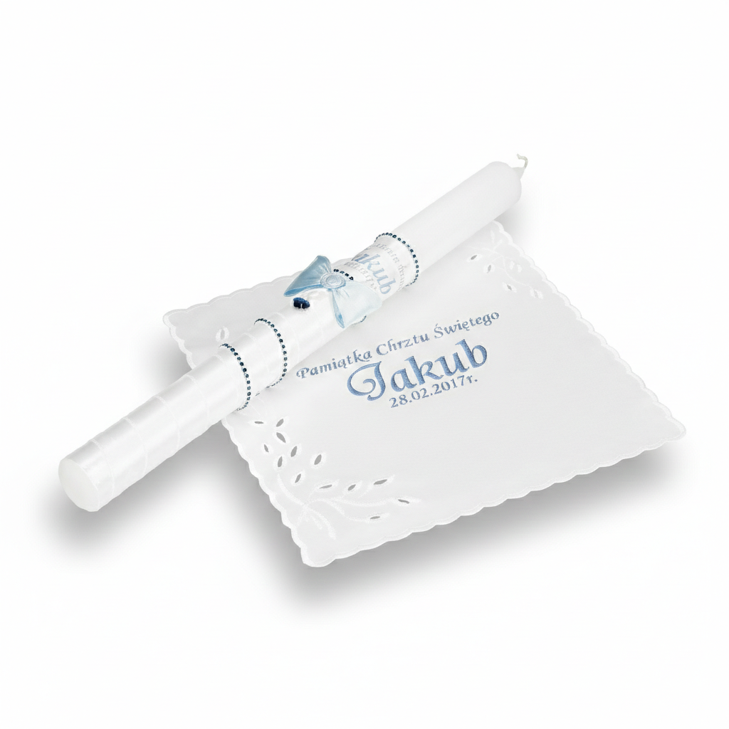 Niebieski zestaw do Chrztu Świętego „Glamour Crystal – Blask Wiary” to wyjątkowa kompozycja symbolizująca spokój, opiekę Maryi i Boże błogosławieństwo. Ręcznie zdobiona świeca z kryształkiem Preciosa® oraz elegancka, atłasowa szatka z personalizacją tworzą harmonijny zestaw pełen duchowej głębi i sakralnego piękna. To pamiątka, która łączy sacrum z subtelnym luksusem.