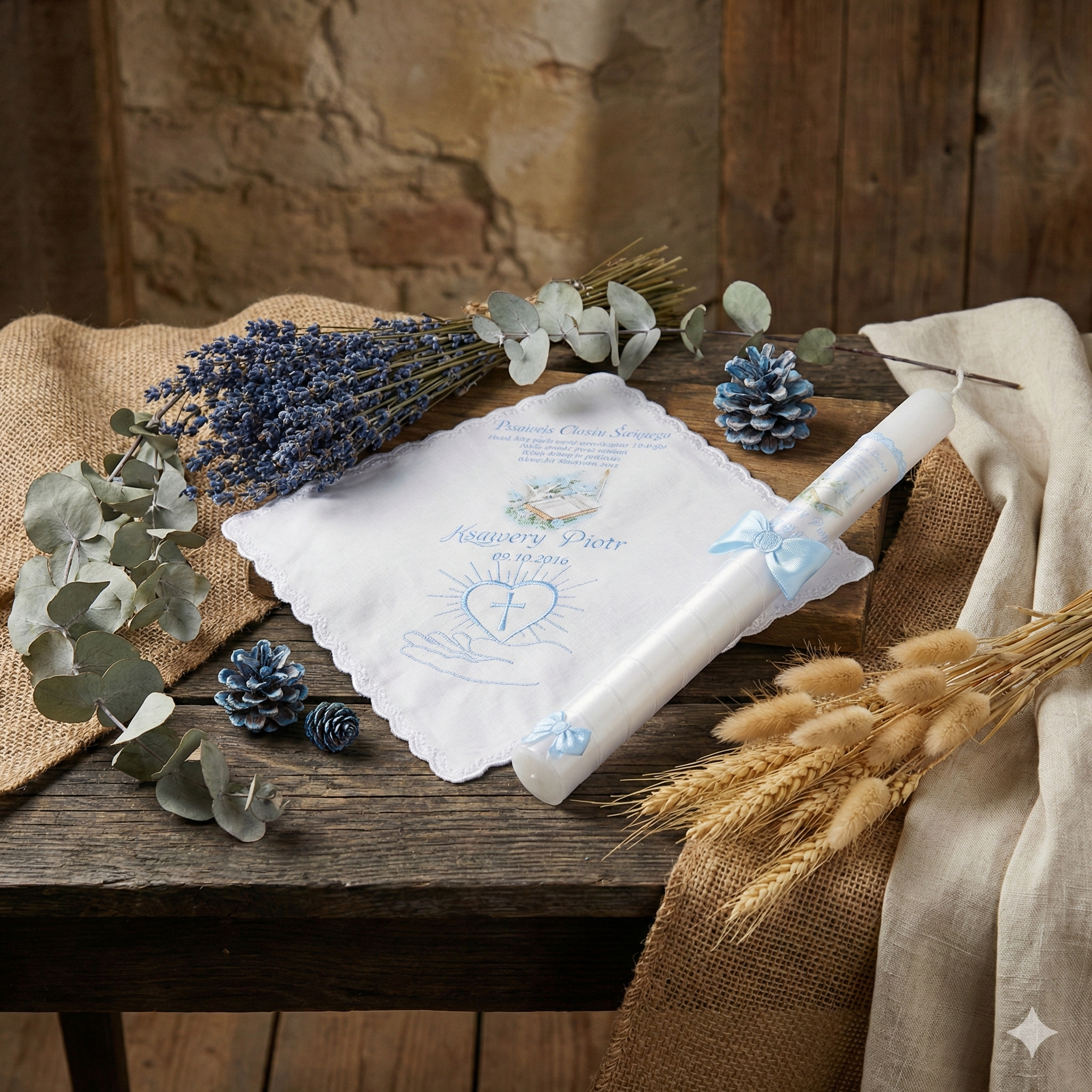 Elegancki zestaw do Chrztu Świętego z haftem do wyboru – „Serce na Dłoni” lub „Duch Święty”. W skład kompletu wchodzi ręcznie zdobiona świeca oraz szatka w formie chusteczki z nadrukiem modlitwy, imienia i daty. Symboliczny, subtelny i pełen duchowego znaczenia – idealna pamiątka Chrztu Świętego.