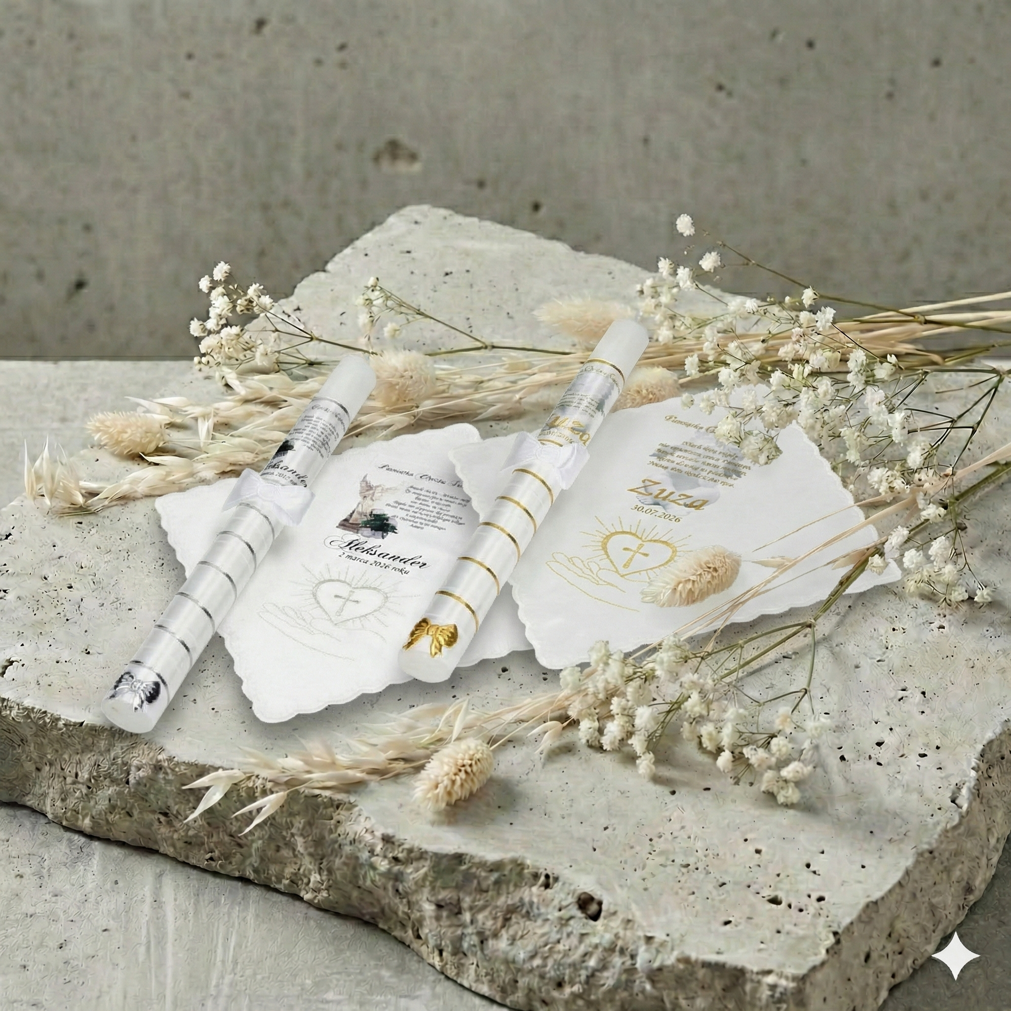 Dobierz dodatki, które podkreślą duchowy i elegancki charakter tej pamiątki.