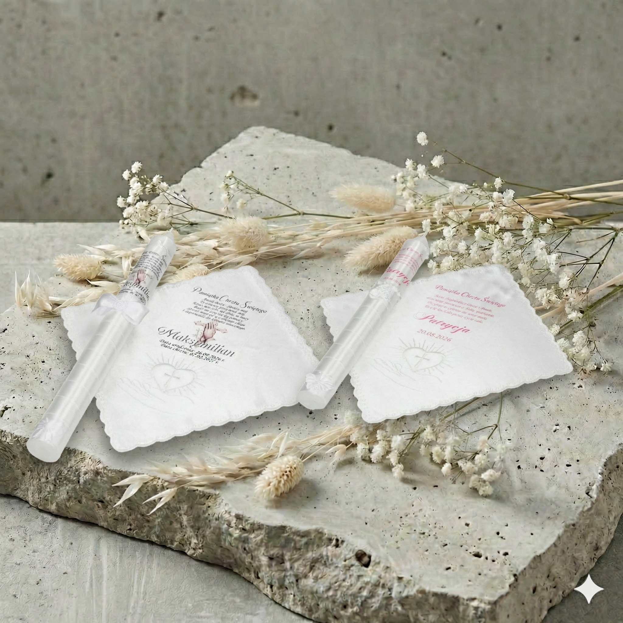 Szatka w formie chusteczki, zdobiona haftem do wyboru – „Serce na Dłoni” lub „Duch Święty” – symbolizuje miłość, opiekę i Bożą obecność. Świeca jest znakiem światła wiary, które ma towarzyszyć dziecku przez całe życie, prowadząc je drogą wiary i nadziei.