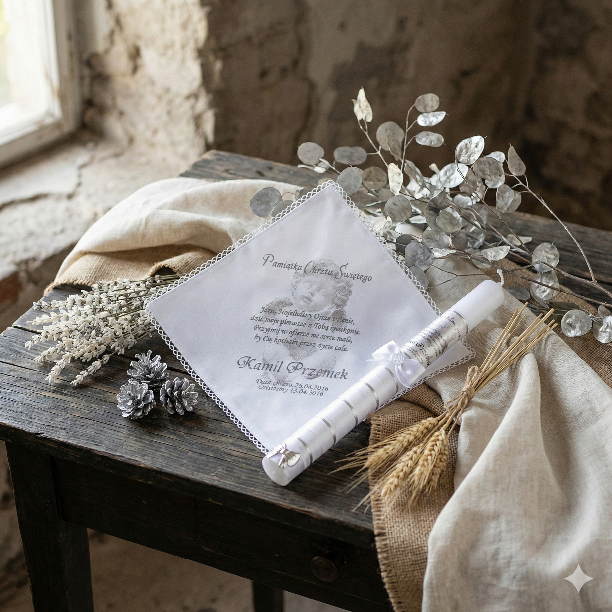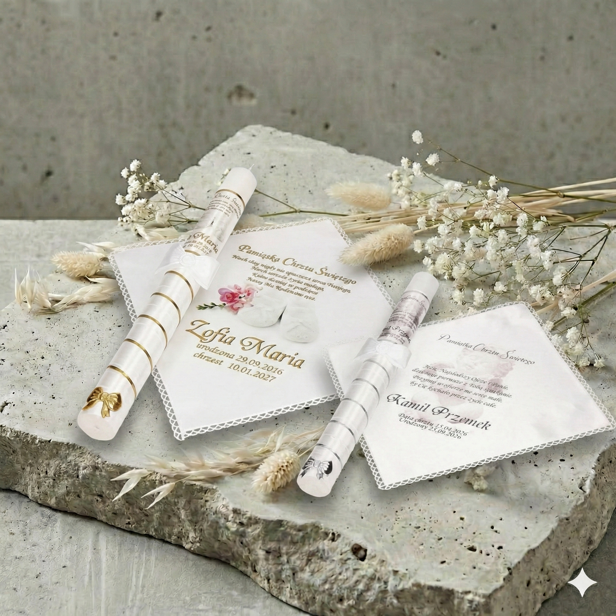 Każdy zestaw można w pełni spersonalizować – nadruk imienia dziecka, daty Chrztu Świętego oraz wybranego wiersza, modlitwy lub cytatu nadaje całości osobisty i niepowtarzalny charakter.