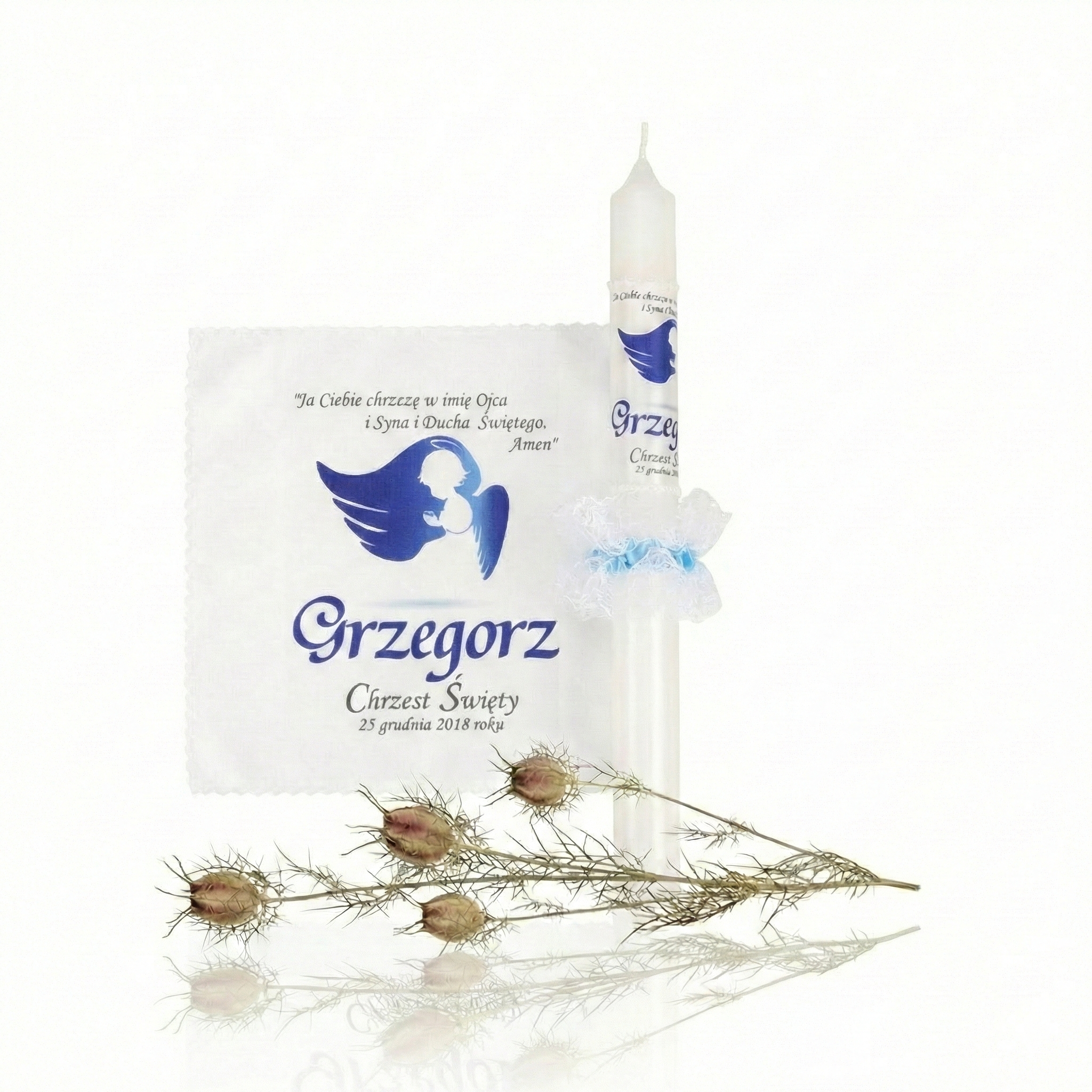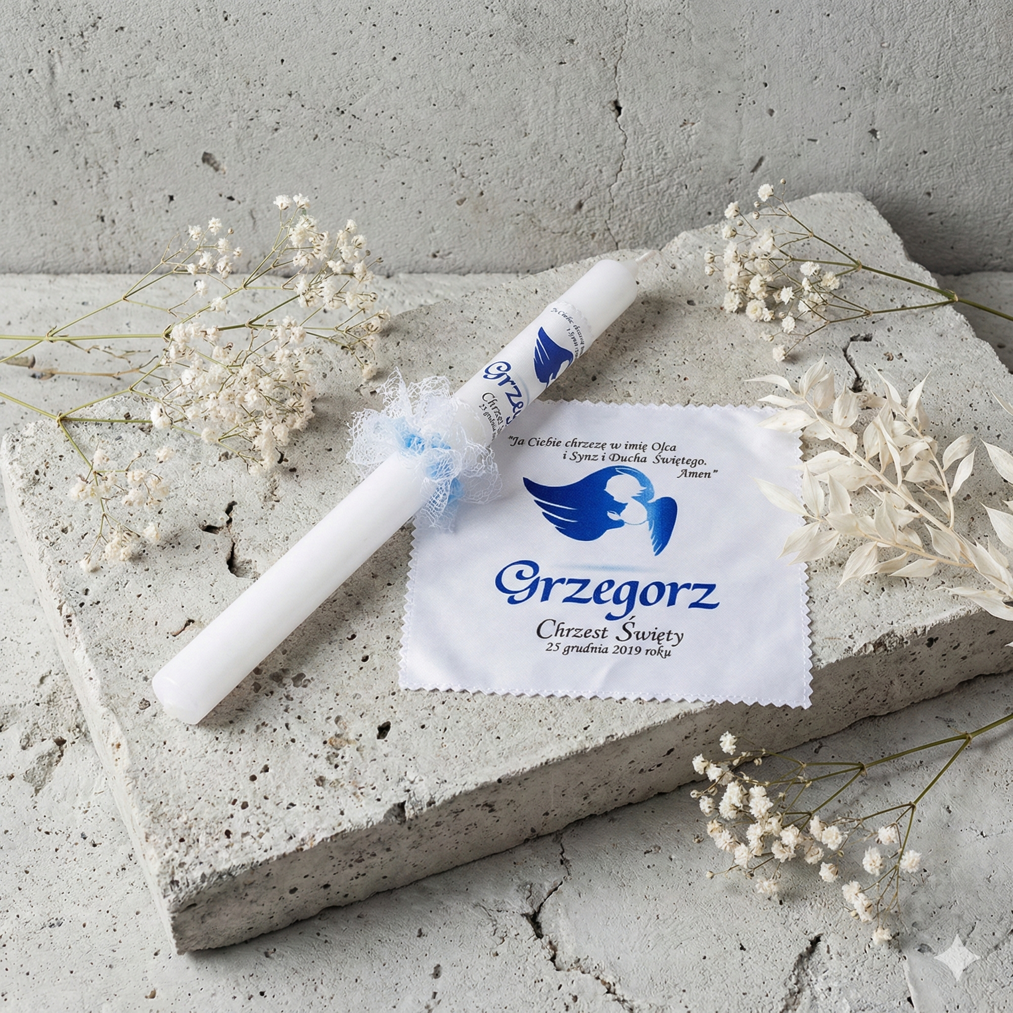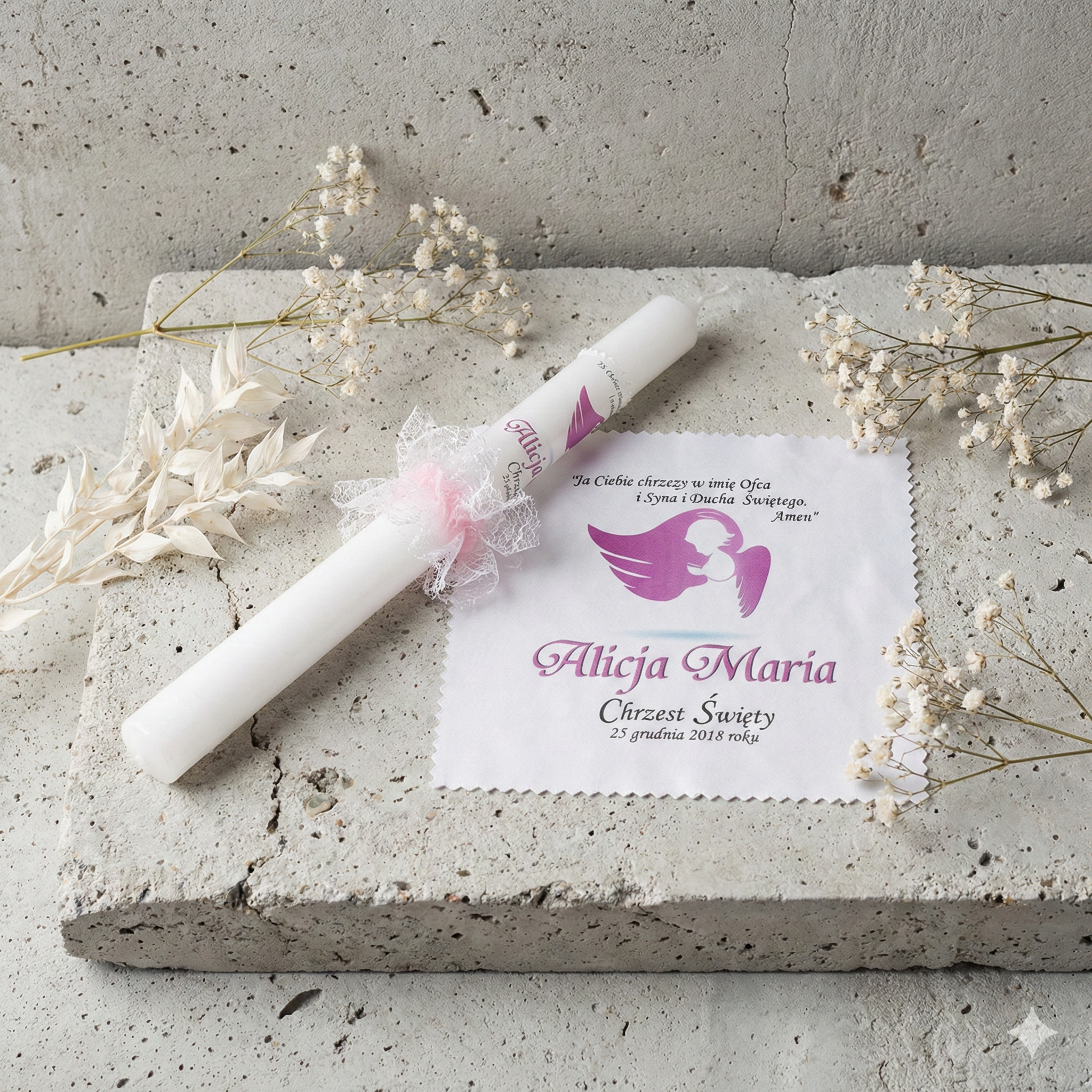 Każdy zestaw wykonujemy na indywidualne zamówienie – z imieniem dziecka oraz datą Chrztu Świętego. Świeca jest ręcznie zdobiona z dbałością o detale i ozdobiona delikatnym stroikiem w formie mgiełki, dzięki czemu nie wymaga dodatkowego okapnika. To wyjątkowa pamiątka, która zachowuje emocje i duchowe piękno tej uroczystości na długie lata.