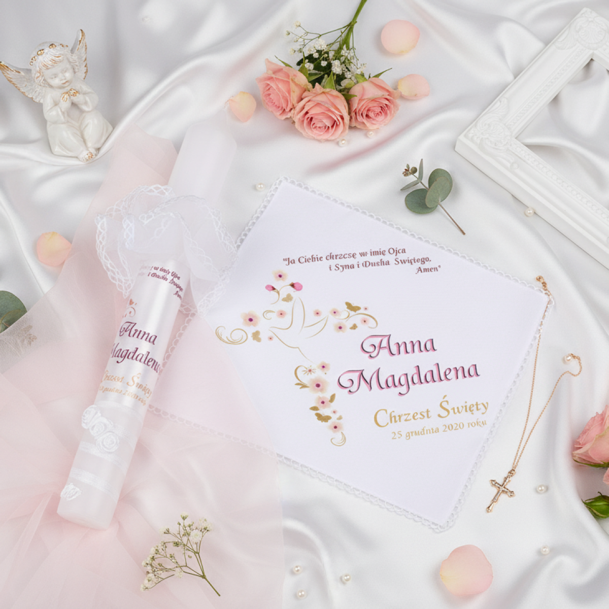 - Szatka atłasowa personalizowana imieniem dziecka, datą Chrztu lub krótkim wierszem. Dostępna w trzech wariantach kolorystycznych: złotym, srebrnym oraz błękitnym. Haft Ducha Świętego nadaje całości uroczysty, głęboko symboliczny charakter.