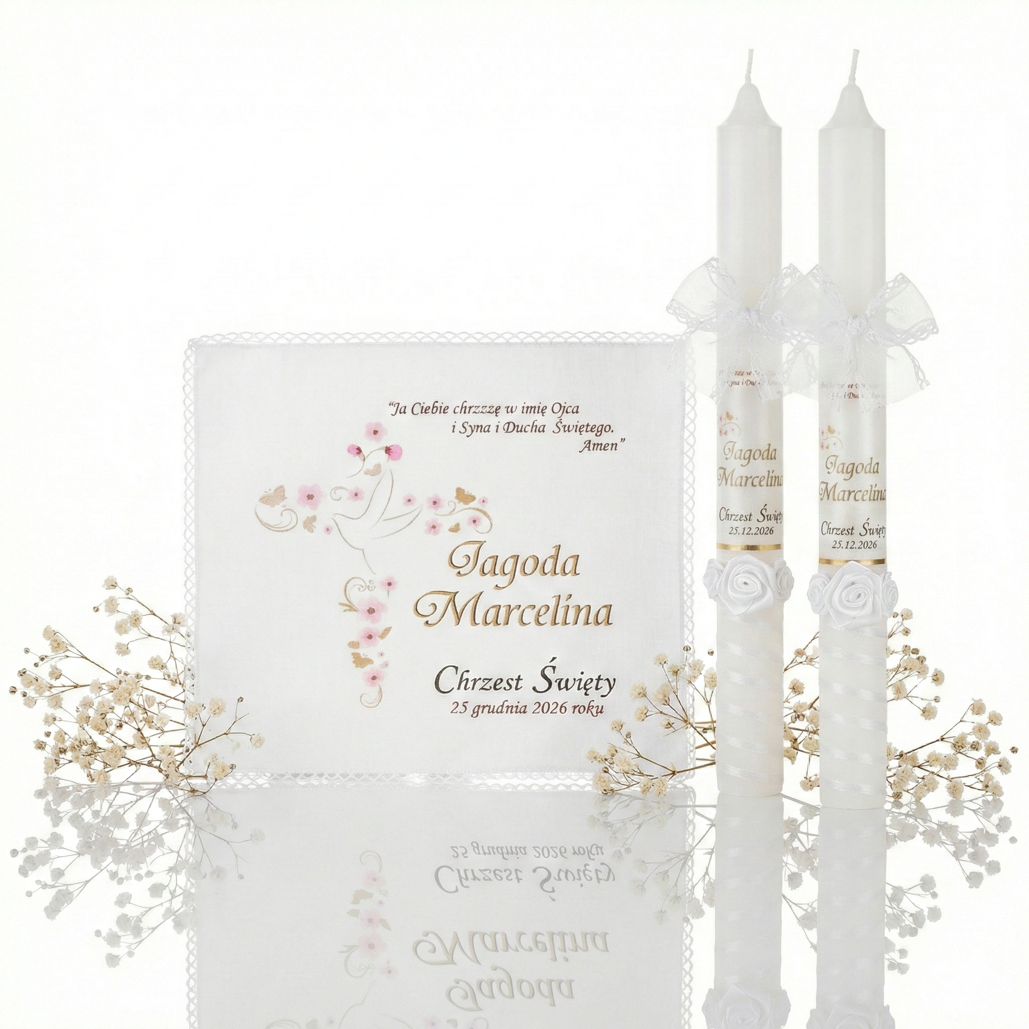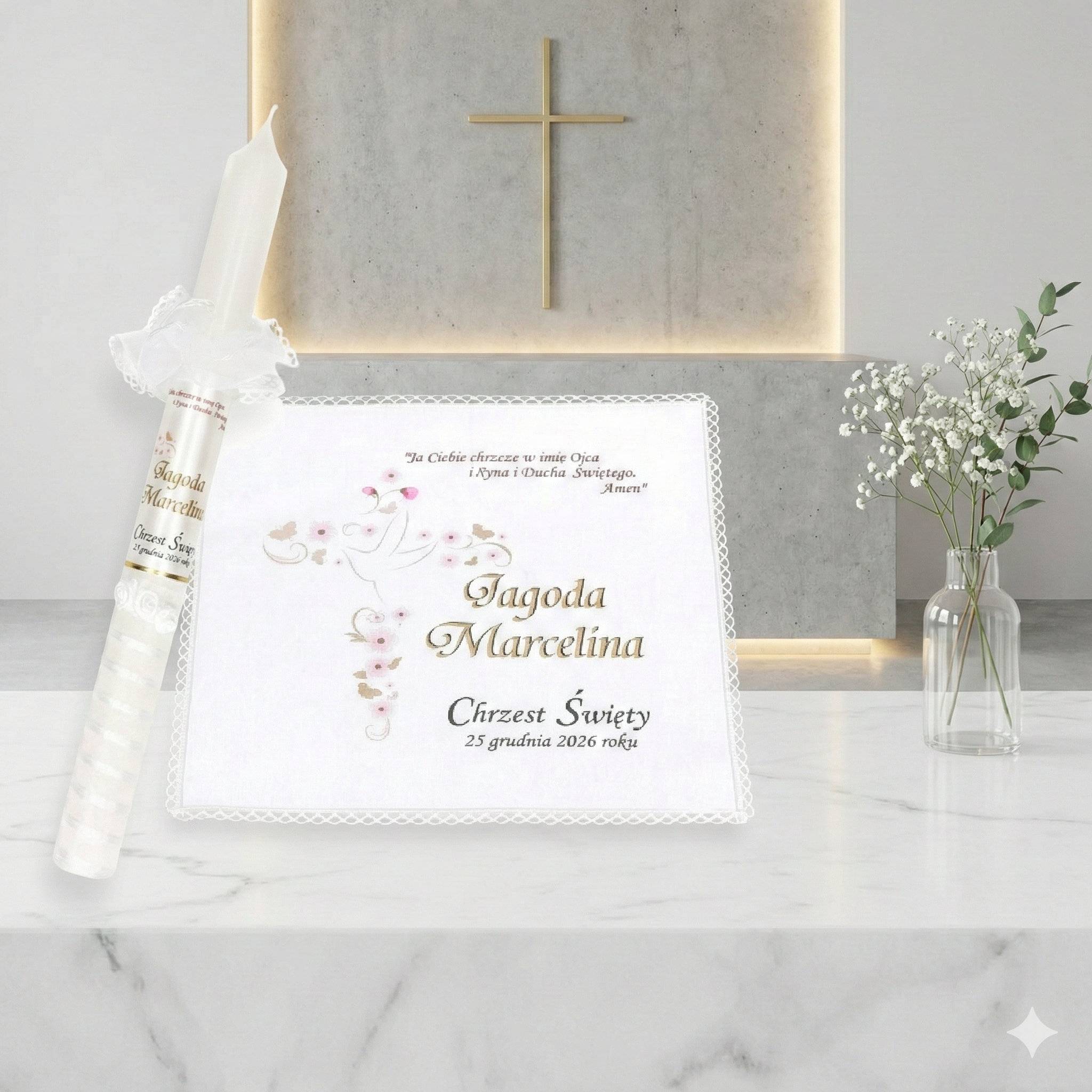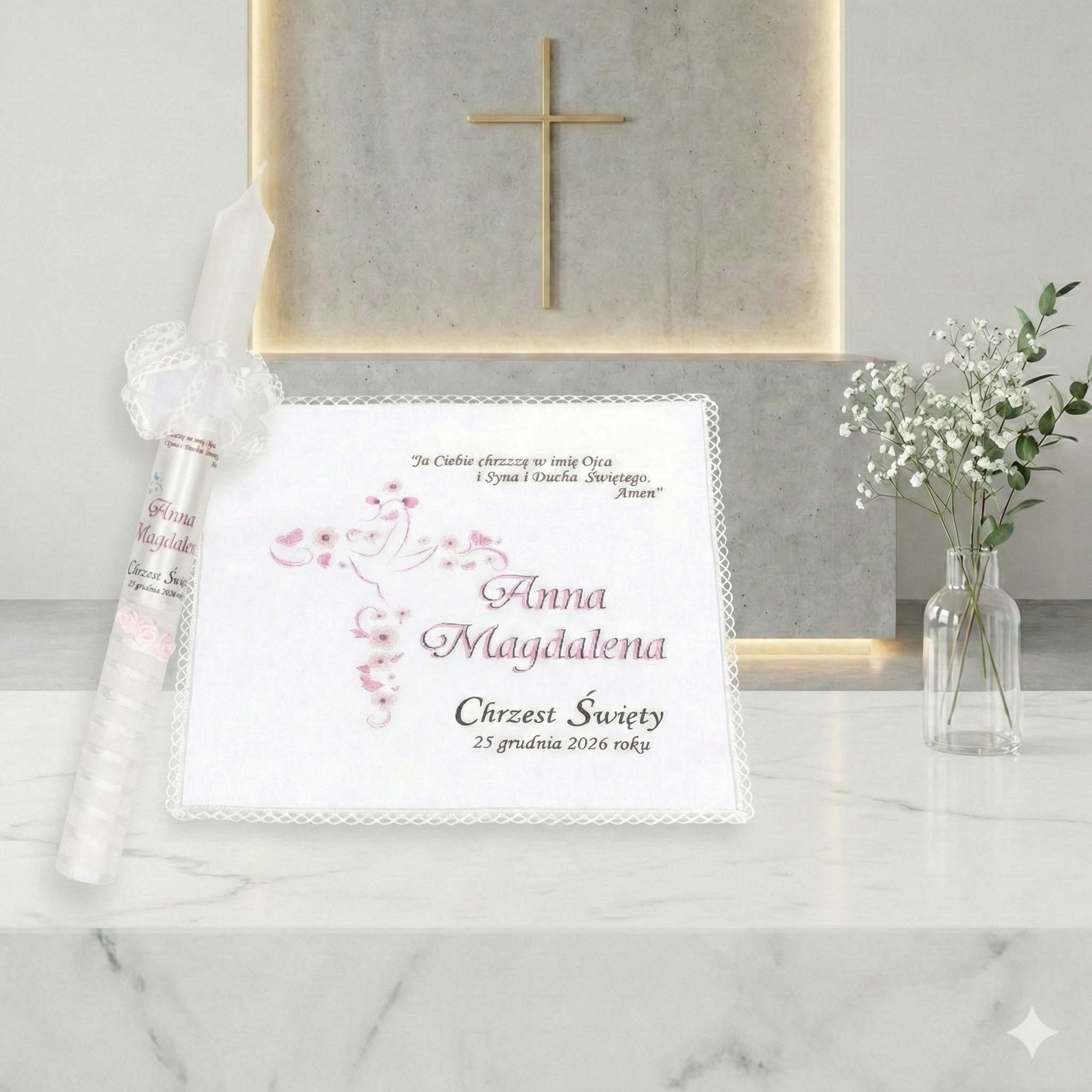 Dobierz dodatki, które subtelnie uzupełnią zestaw i stworzą spójną pamiątkę Chrztu Świętego.