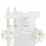 Świeca i szatka do Chrztu z imieniem – ozdobny stroik „Amazon”. Szatka koszulka z haftem serce na dłoni, personalizacja w 4 kolorach (złoto, srebro, róż, błękit), ręcznie dekorowana świeca. Elegancka i symboliczna pamiątka chrzcielna.