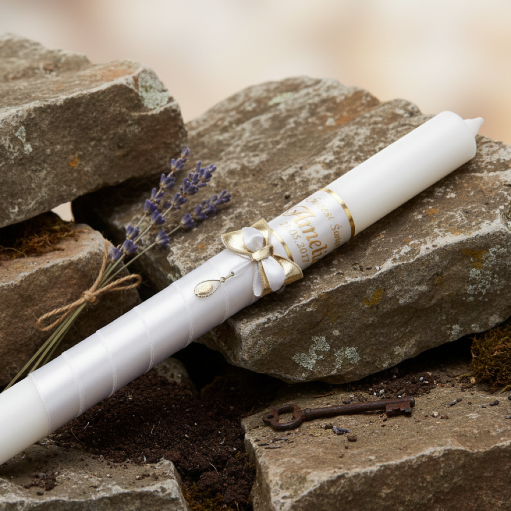 Każda świeca wykonywana jest indywidualnie z możliwością dodania imienia dziecka, daty uroczystości oraz dedykacji. Nadruk wykonywany w technologii druku cyfrowego Ink-Jet gwarantuje trwałość i precyzję. Złoty medalik pr. 585 montowany jest ręcznie, z zachowaniem najwyższej staranności. Całość tworzy pamiątkę pełną duchowego i emocjonalnego znaczenia.