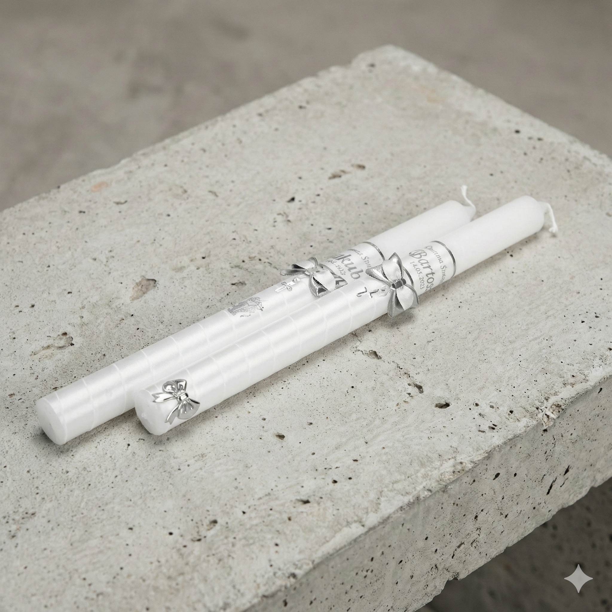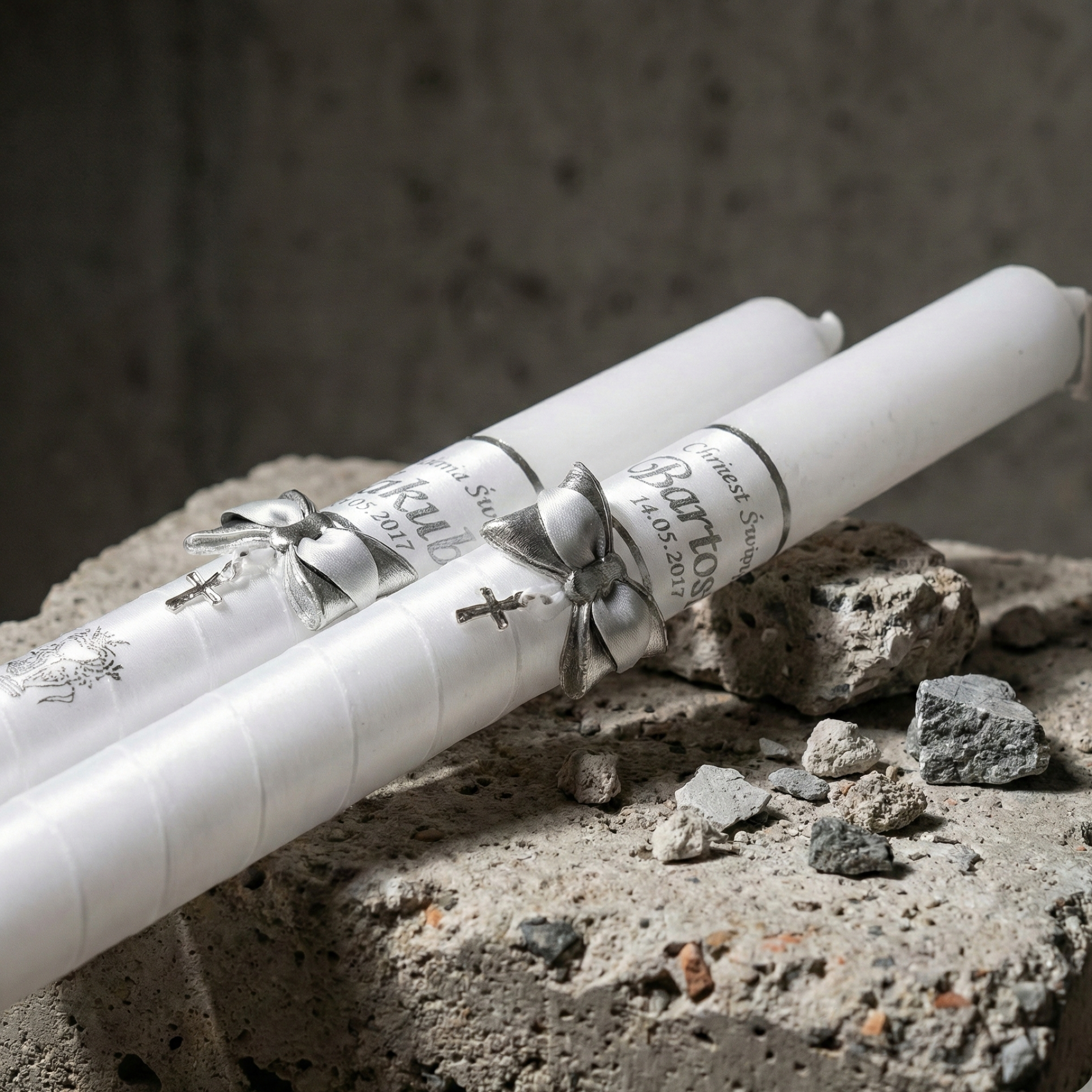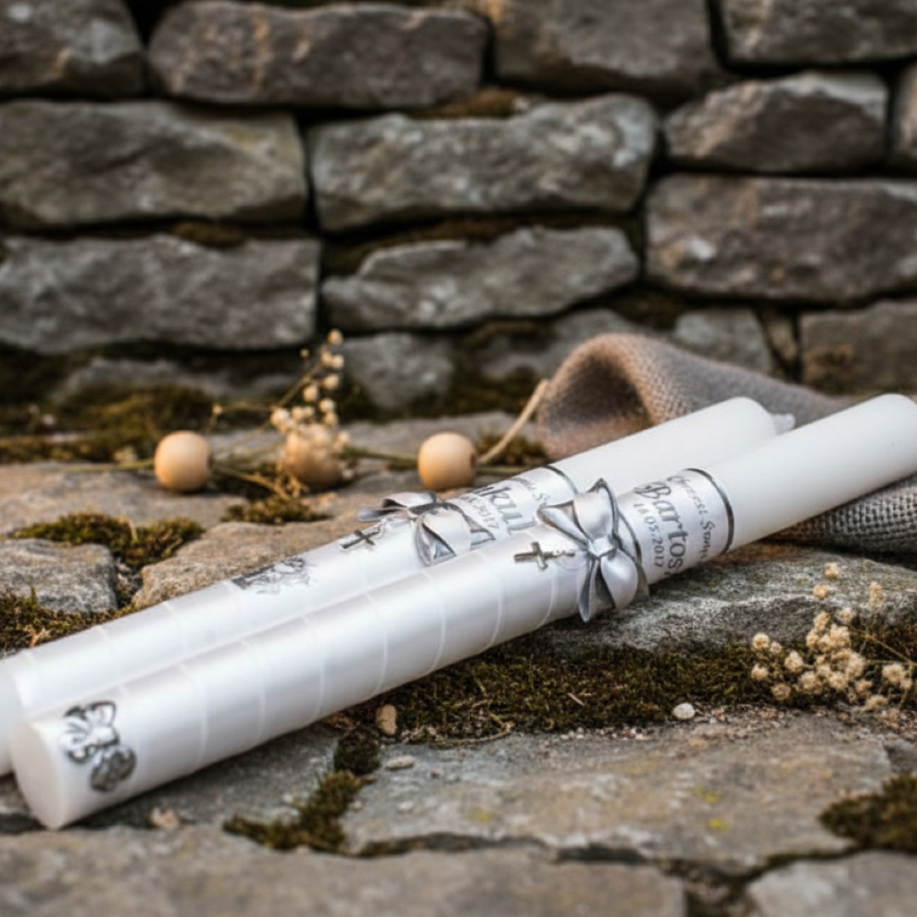 Każda świeca jest personalizowana – można dodać imię dziecka, datę uroczystości oraz dedykację. Nadruk wykonany w technologii druku cyfrowego Ink-Jet gwarantuje trwałość i eleganckie wykończenie. Ręcznie nakładany krzyżyk ze srebra próby 925 dopełnia całości, nadając świecy prestiżowy i szlachetny charakter.