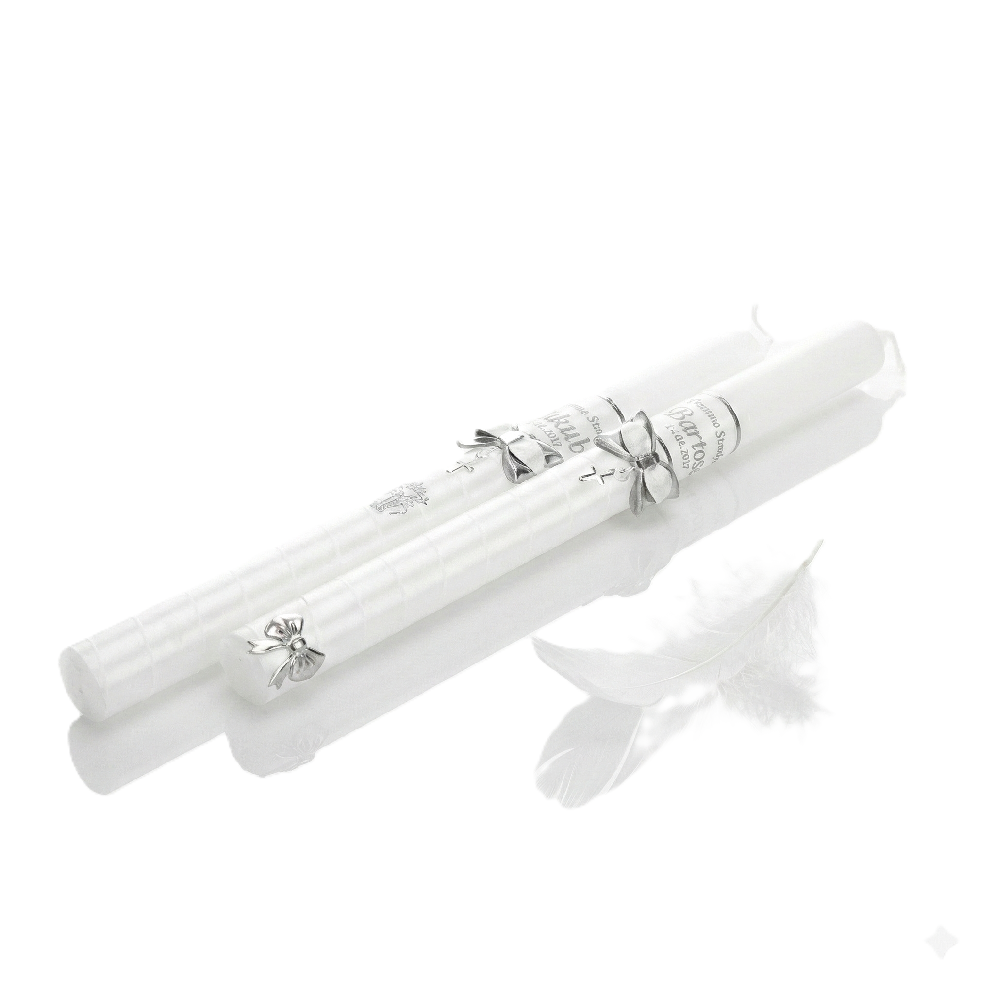 Elegancka świeca imienna z kolekcji AURORA® – Światło i Symbol Wiary. Ręcznie zdobiona i ozdobiona srebrnym krzyżykiem z prawdziwego srebra próby 925. Personalizowana imieniem i datą uroczystości. Idealna pamiątka Chrztu lub Komunii Świętej – symbol wiary, światła i duchowego piękna.