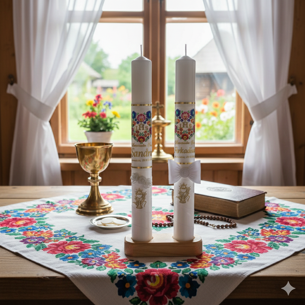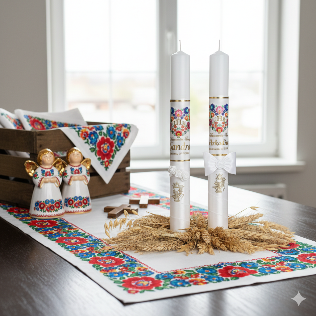 Zapalenie świecy podczas uroczystości komunijnej symbolizuje przyjęcie światła Chrystusa i gotowość dziecka do świadomego uczestnictwa w życiu sakramentalnym. Styl FolkStyle® nadaje świecy ciepły, autentyczny charakter, czyniąc ją piękną i znaczącą pamiątką tego wyjątkowego dnia.
