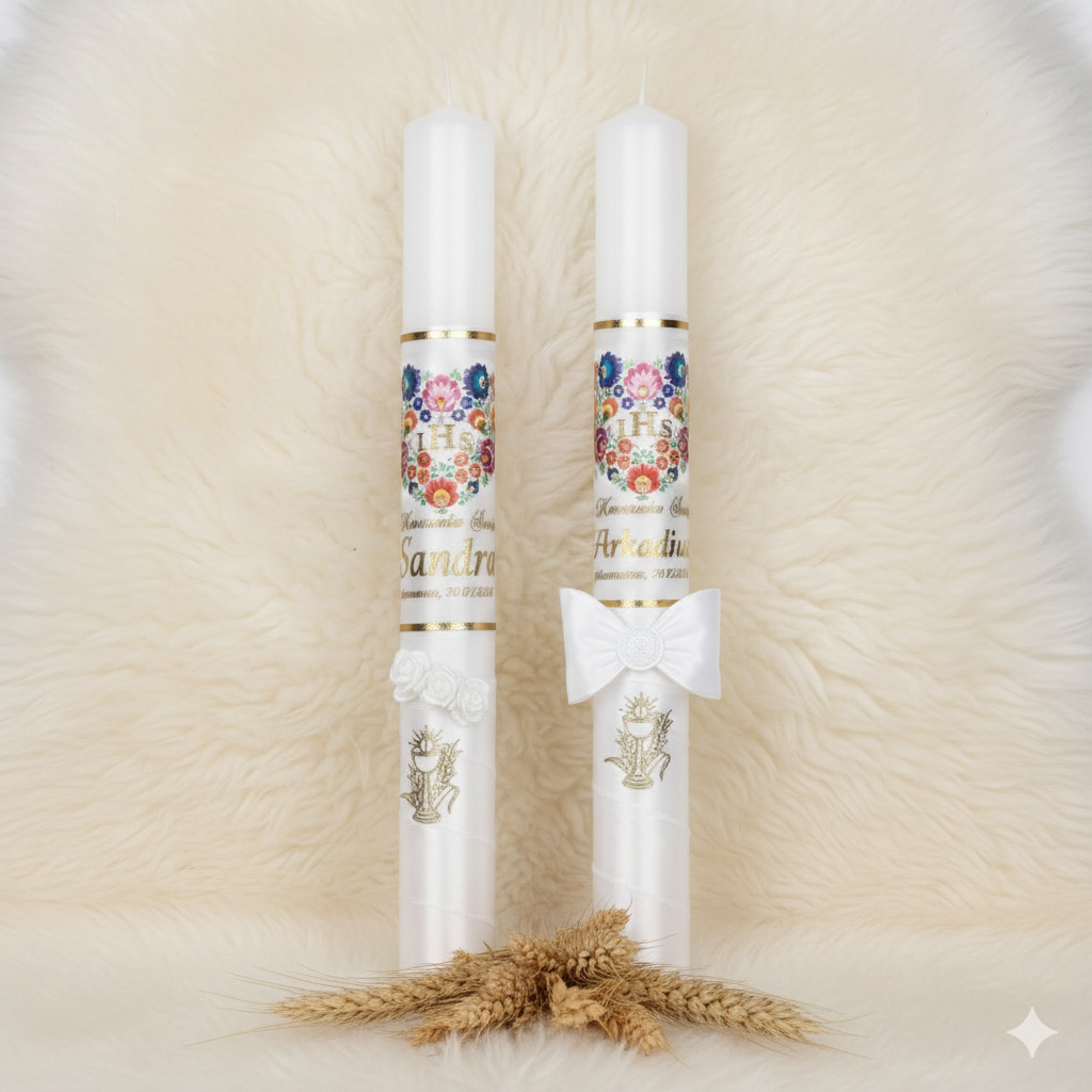 Elegancka świeca komunijna w stylu FolkStyle®, inspirowana polską sztuką ludową. Ręcznie zdobiona, pełna symboliki światła, wiary i tradycji – idealna pamiątka Pierwszej Komunii Świętej.