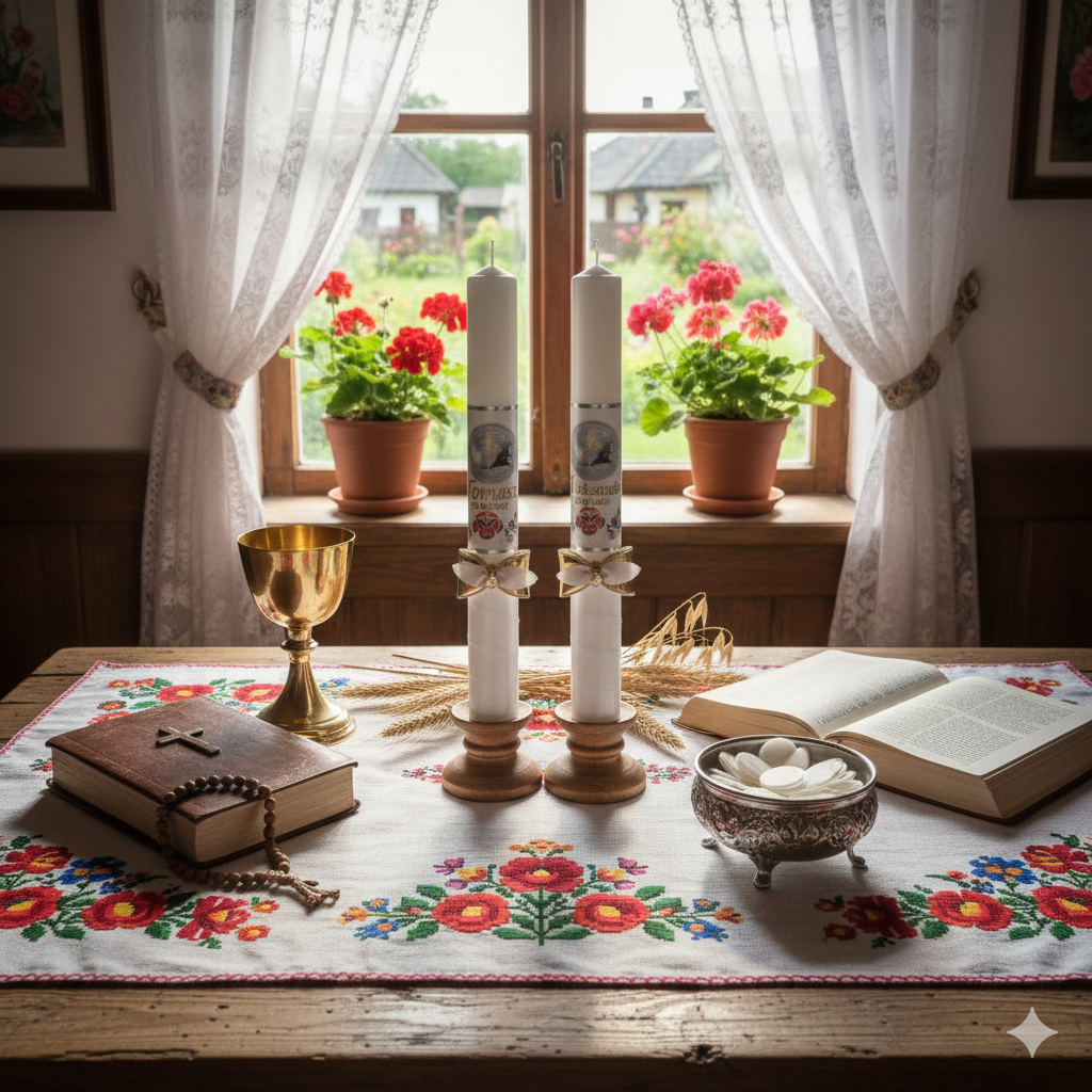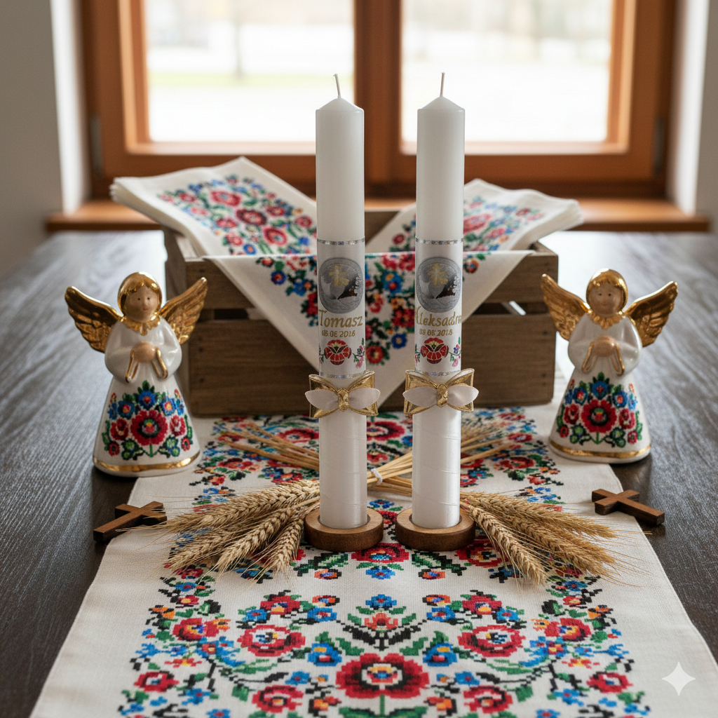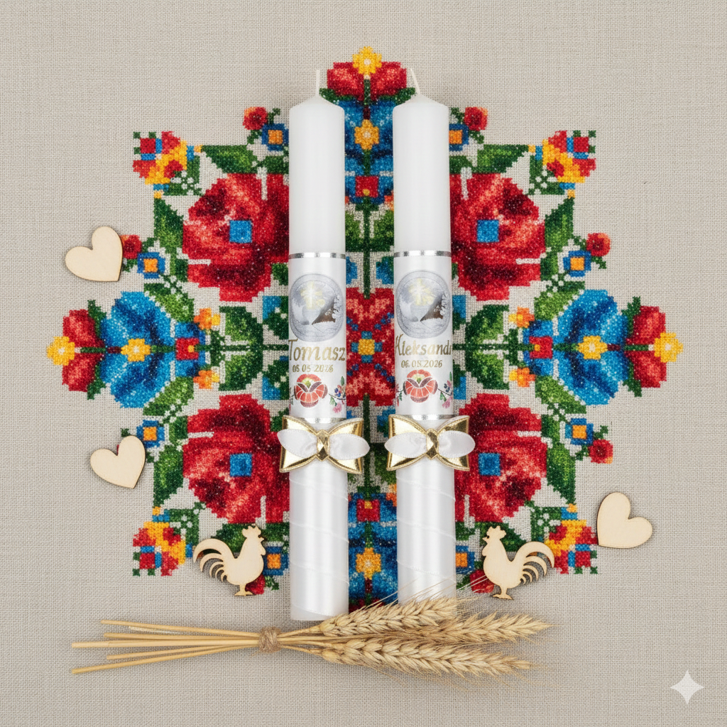 Styl FolkStyle® to świadome nawiązanie do polskiej sztuki ludowej — prostoty, symboliki i autentyczności, które pięknie współgrają z sakramentalnym charakterem uroczystości.