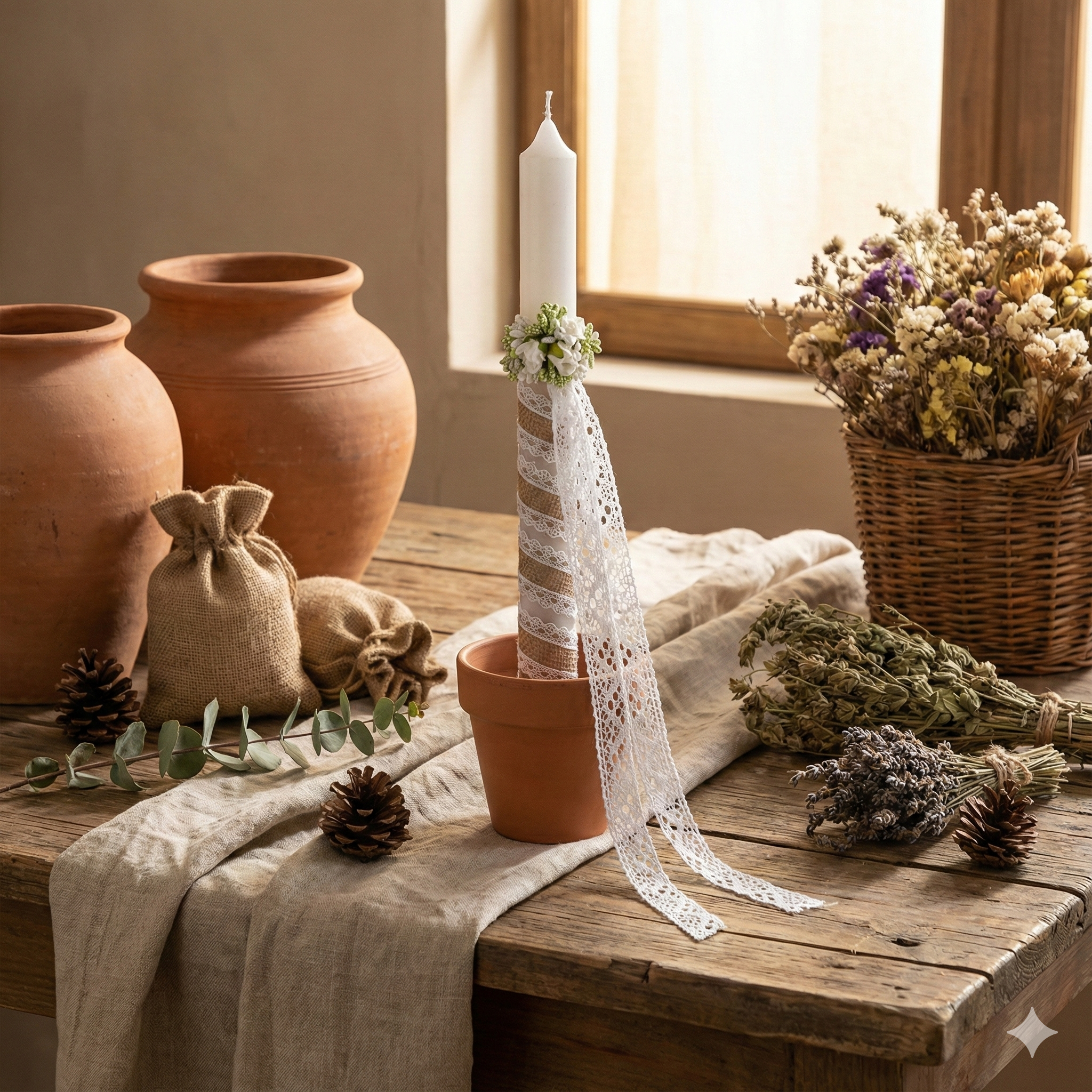 Każda świeca jest ręcznie zdobiona z dbałością o proporcje, estetykę i detal. Stroik tworzony z naturalnych elementów – juty, suszonych roślin i ekologicznego sznurka – nadaje świecy spokojny, szlachetny charakter w duchu eko. Wysokiej jakości wosk zapewnia czyste, równomierne i stabilne palenie, sprzyjające modlitwie i chwilom skupienia.