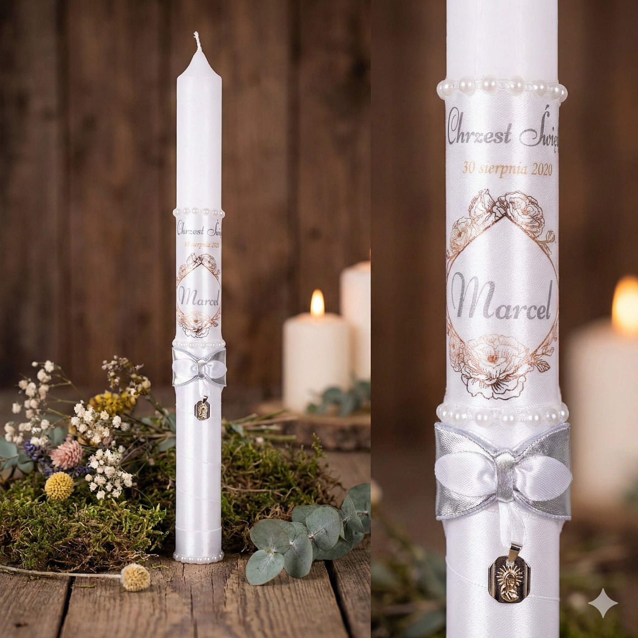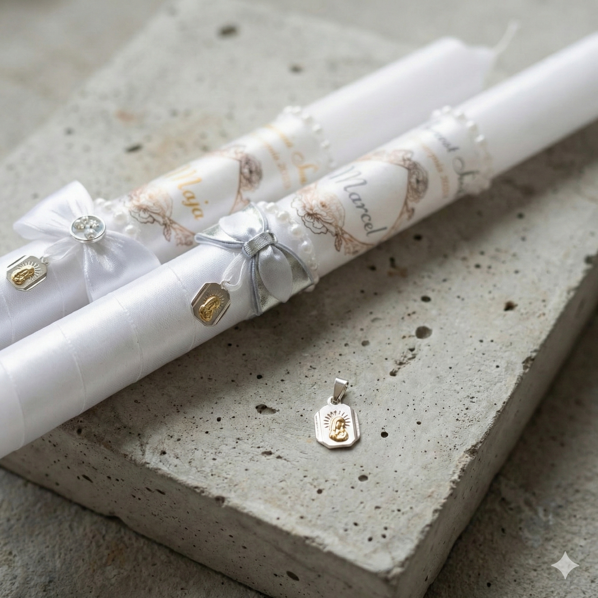 Każda świeca wykonywana jest z najwyższą starannością – z możliwością dodania imienia, daty i dedykacji. Personalizowany nadruk wykonujemy w technologii druku cyfrowego Ink-Jet, który gwarantuje trwałość i eleganckie wykończenie. Srebrny medalik umieszczony na świecy podkreśla jej sakralny charakter i duchową wartość.