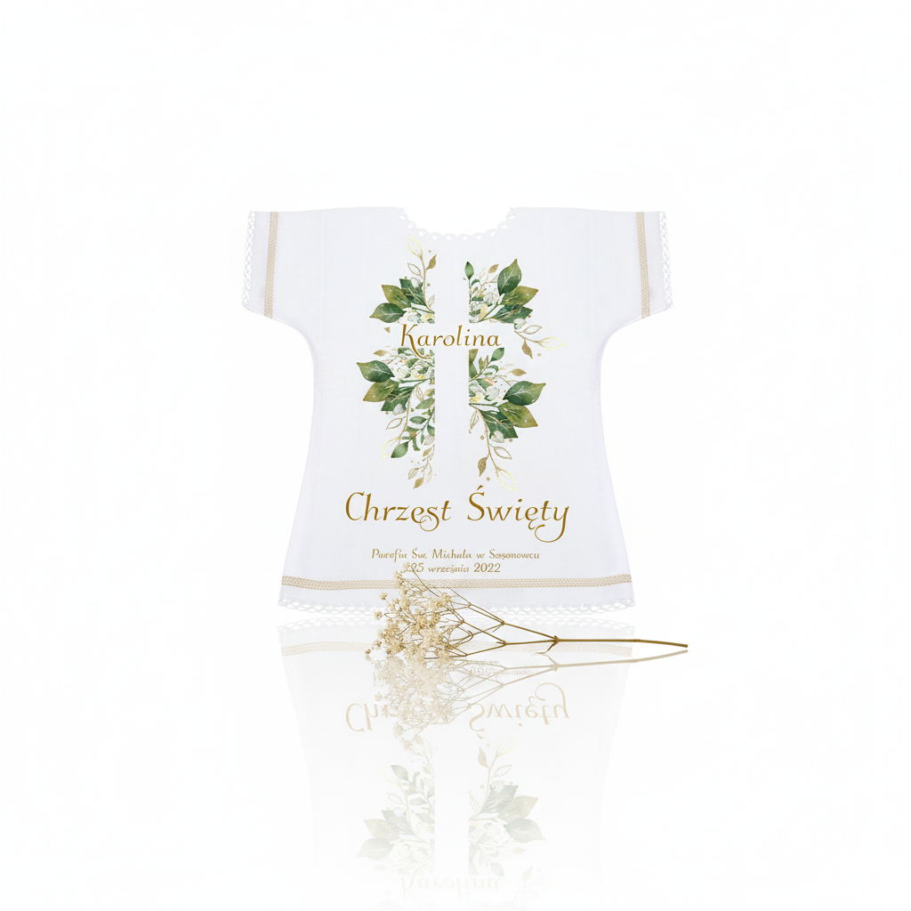 Szatka na Chrzest KRZYŻ z motywem eukaliptusa w formie atłasowej koszulki. Personalizowany nadruk imienia i daty, subtelny design i trwała jakość tworzą wyjątkową pamiątkę o symbolicznym znaczeniu.