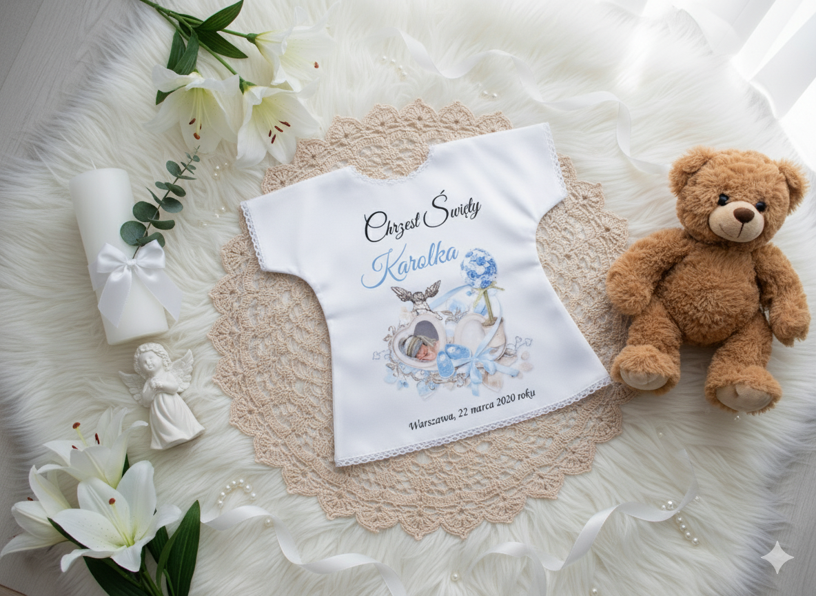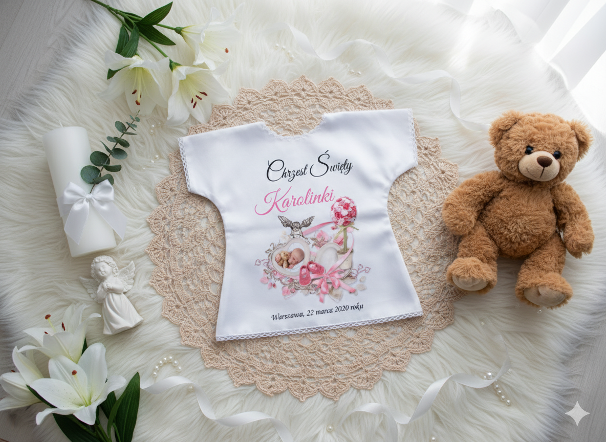 Szatka na Chrzest LITTLE ANGEL ze zdjęciem dziecka w formie atłasowej koszulki. Personalizowany nadruk cyfrowy z imieniem i datą w pastelowej wersji Pudrowy Róż lub Anielski Błękit – subtelna i elegancka pamiątka pełna ciepła.