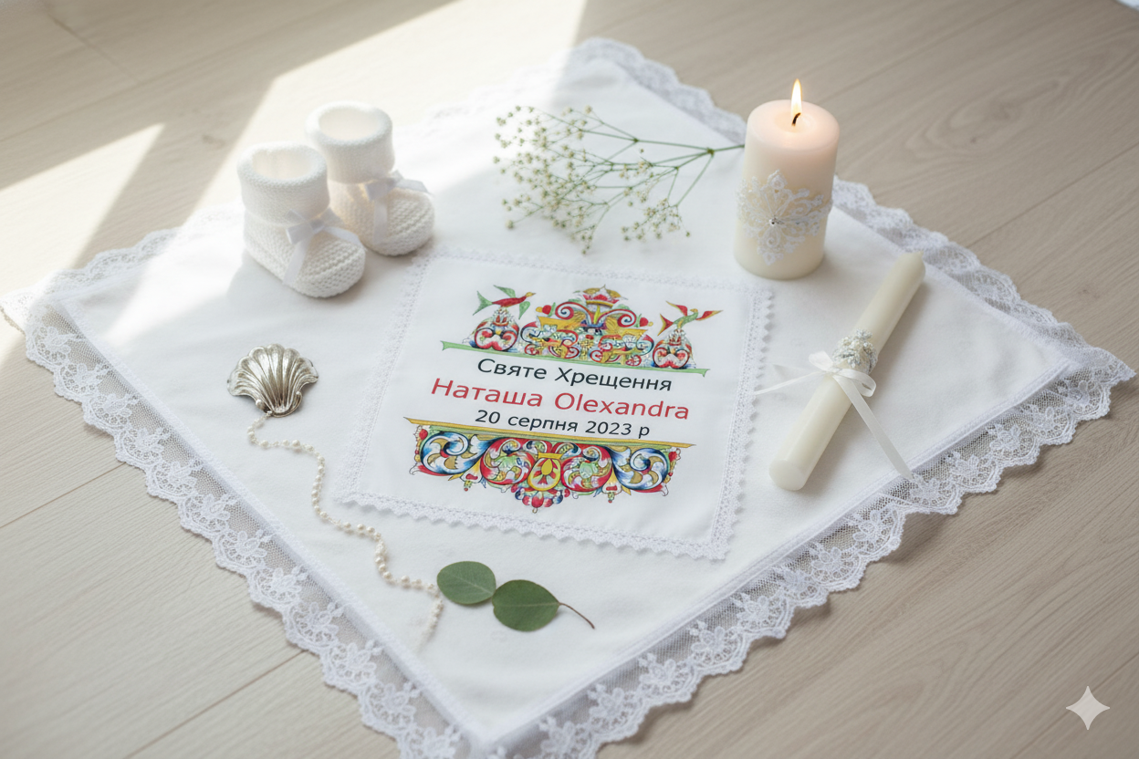 Szatka na Chrzest PRAWOSŁAWNA z symbolem ortodoksyjnym i personalizacją. Dostępna w czterech wariantach: chusteczka, szal, koszulka z laserem lub koronką. Elegancka pamiątka w duchu tradycji Cerkwi.