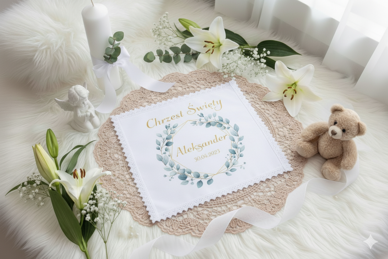 - Personalizowana szatka z imieniem, datą i dedykacją.
