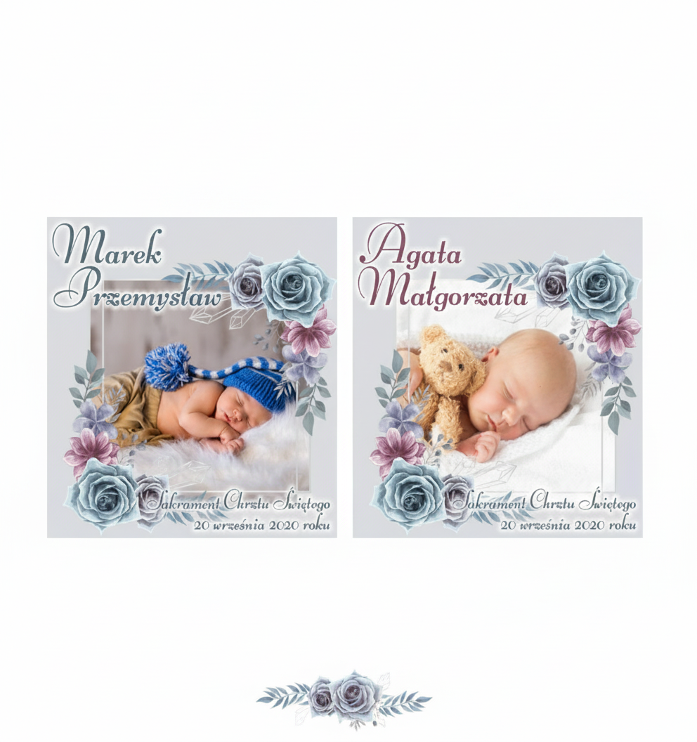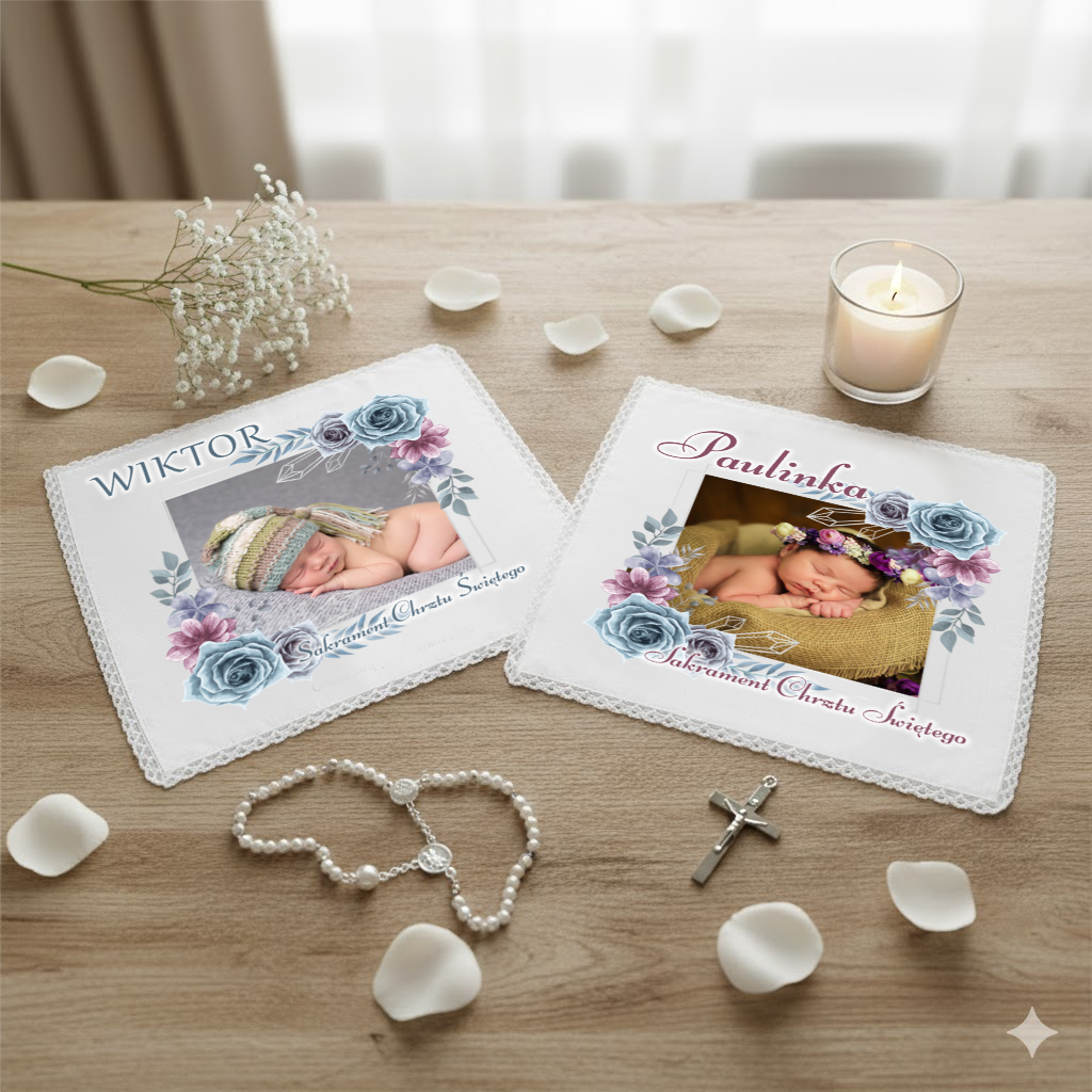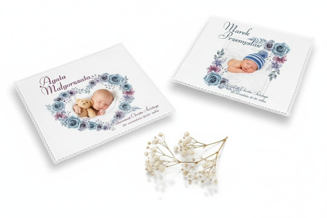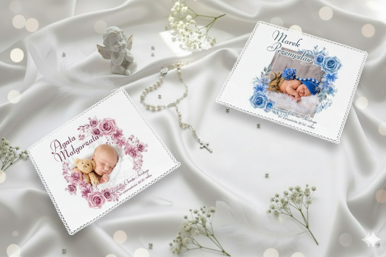 - Personalizowana szatka ze zdjęciem, imieniem i datą.
