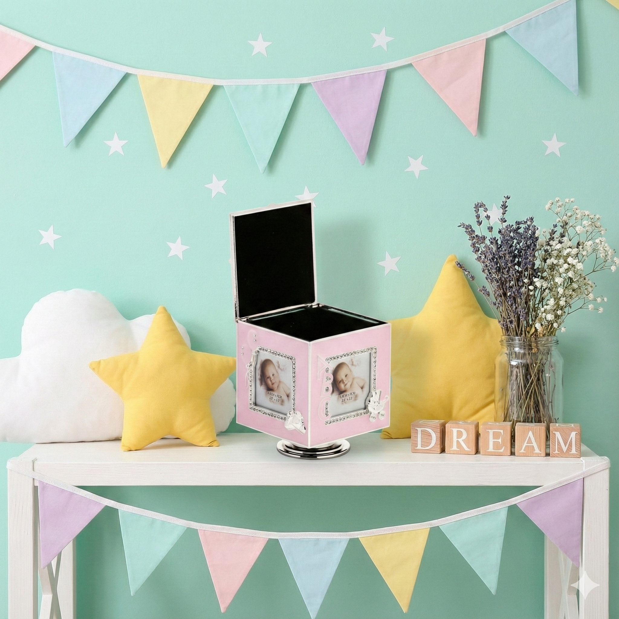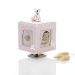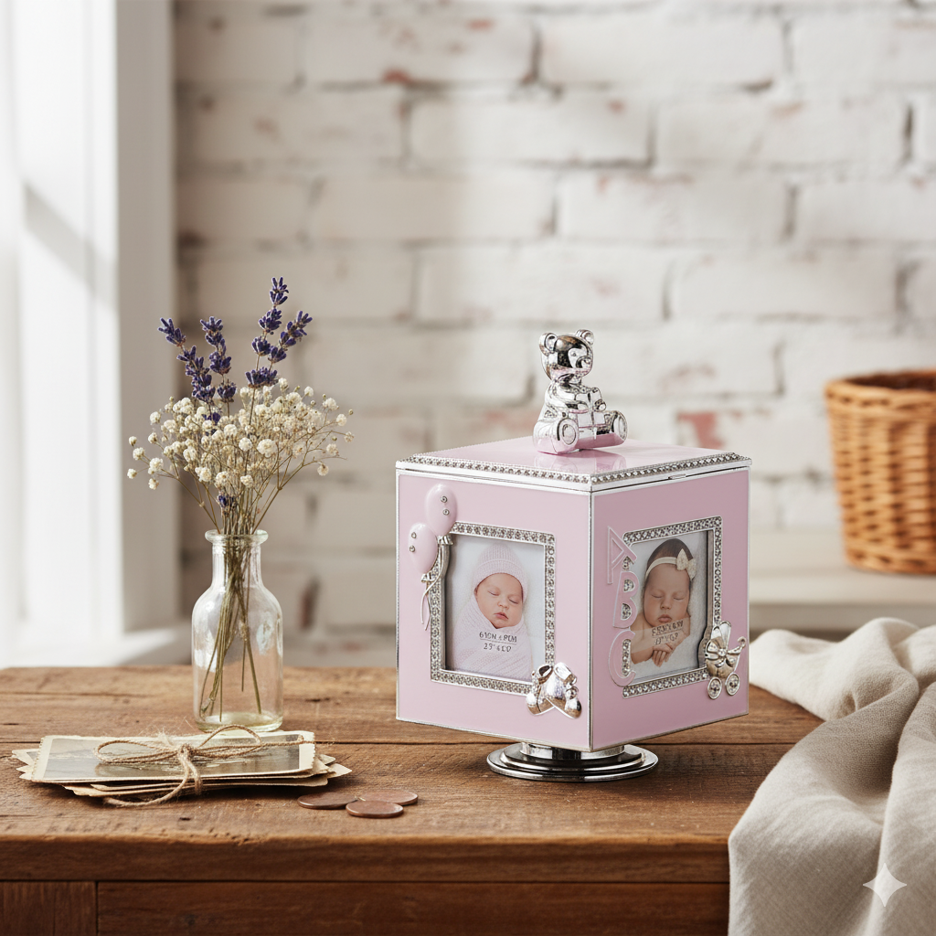 Ta urocza szkatułka-pozytywka z kolekcji BAMBINO® PINK łączy klasyczną elegancję z dziecięcą delikatnością. Obrotowa forma z czterema ramkami (5×5 cm) pozwala zatrzymać w kadrze najpiękniejsze wspomnienia z narodzin, Chrztu i pierwszych urodzin dziecka. Różowe akcenty i posrebrzane detale podkreślają subtelność i ciepło dzieciństwa.