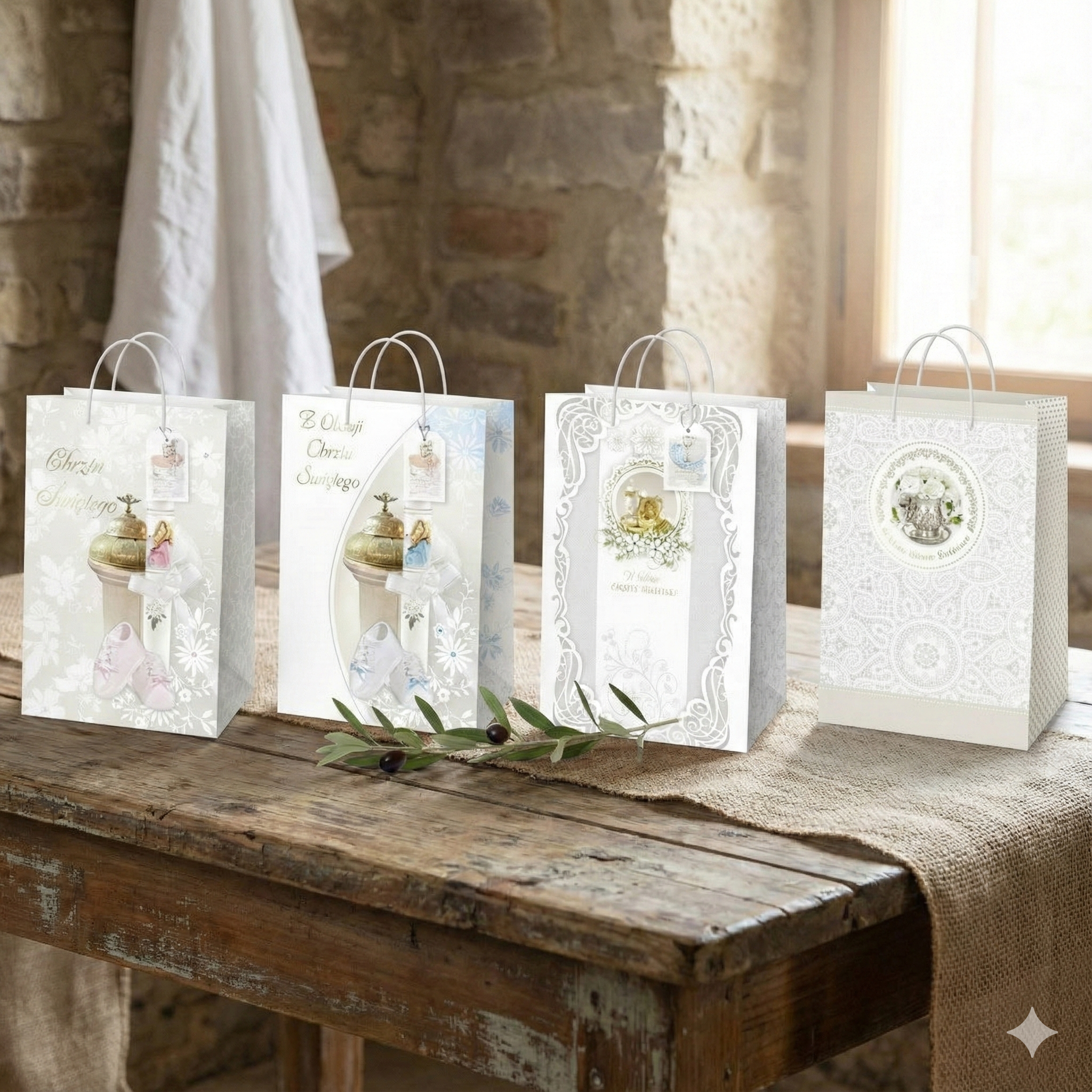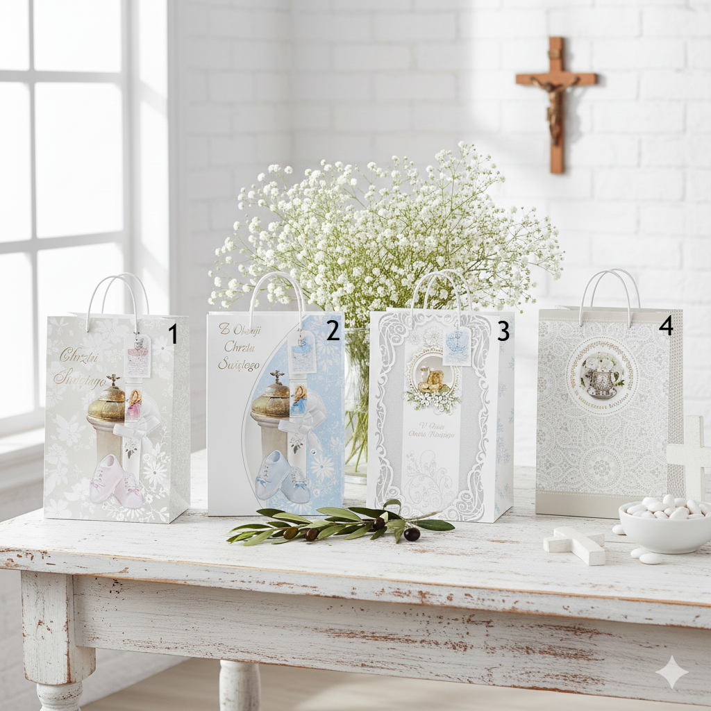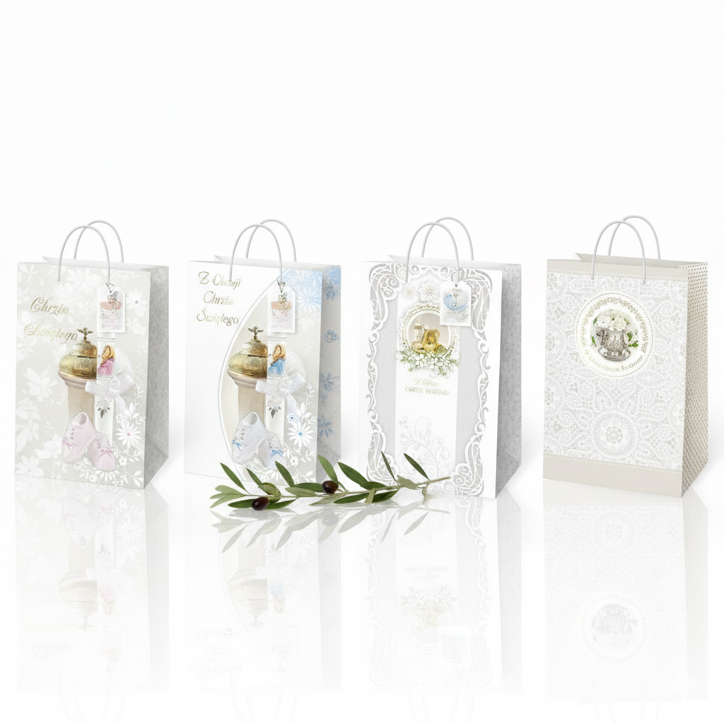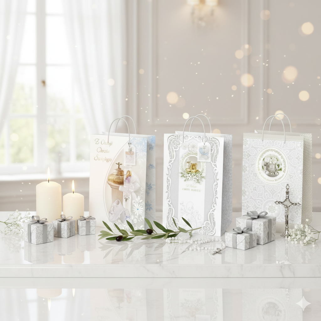 Dobierz idealną torebkę prezentową na Chrzest Święty oraz elegancką kartkę z życzeniami, aby stworzyć spójną i odświętną oprawę prezentu.