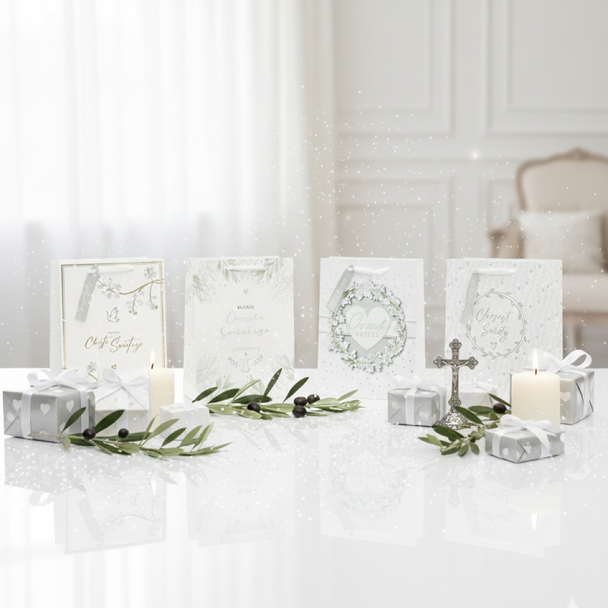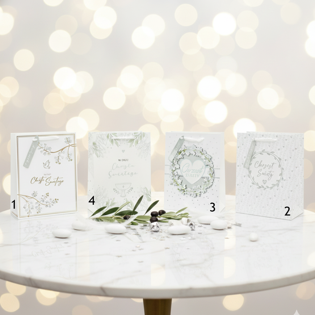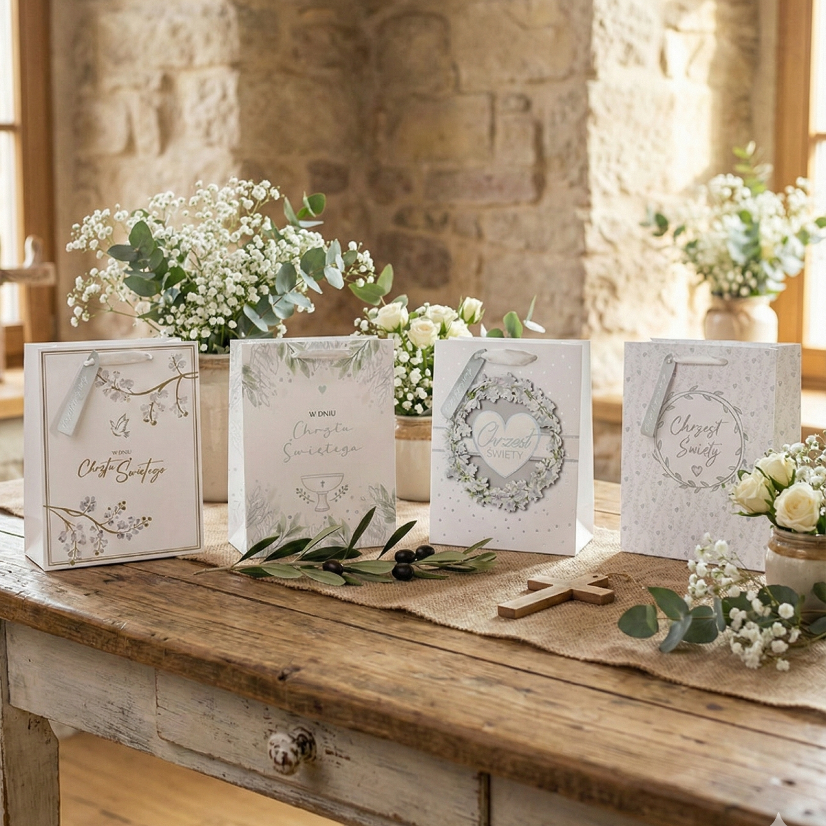 Dobierz idealną torebkę prezentową na Chrzest Święty oraz elegancką kartkę z życzeniami, aby stworzyć spójną i odświętną oprawę prezentu.