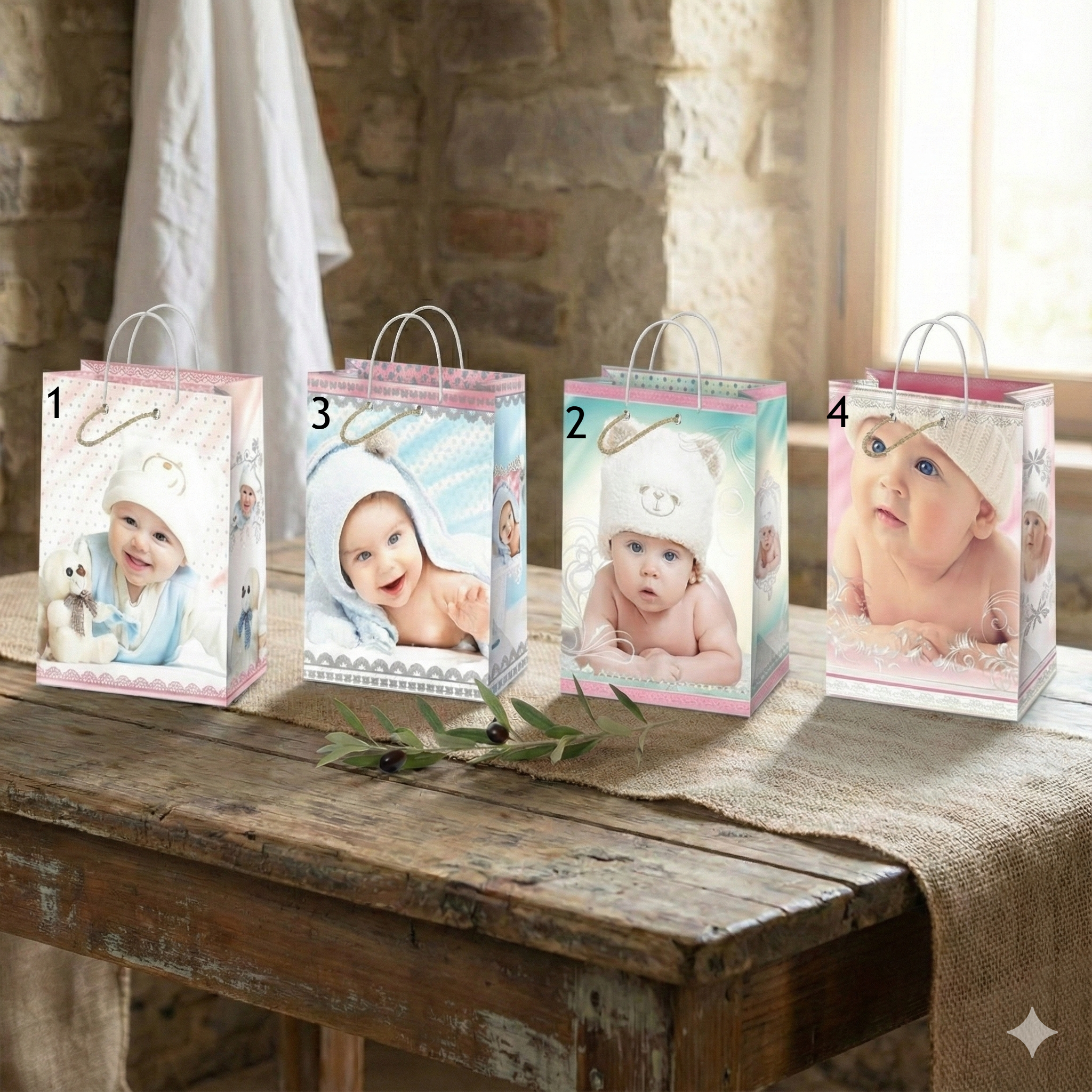Torba wykonana jest z papieru w całości zadrukowanego dekoracyjnym motywem BABY, przedstawiającym urocze niemowlęce fotografie i pastelowe detale. To wzór idealny zarówno dla dziewczynki, jak i dla chłopca, doskonale wpisujący się w nowoczesny styl prezentów dla najmłodszych.