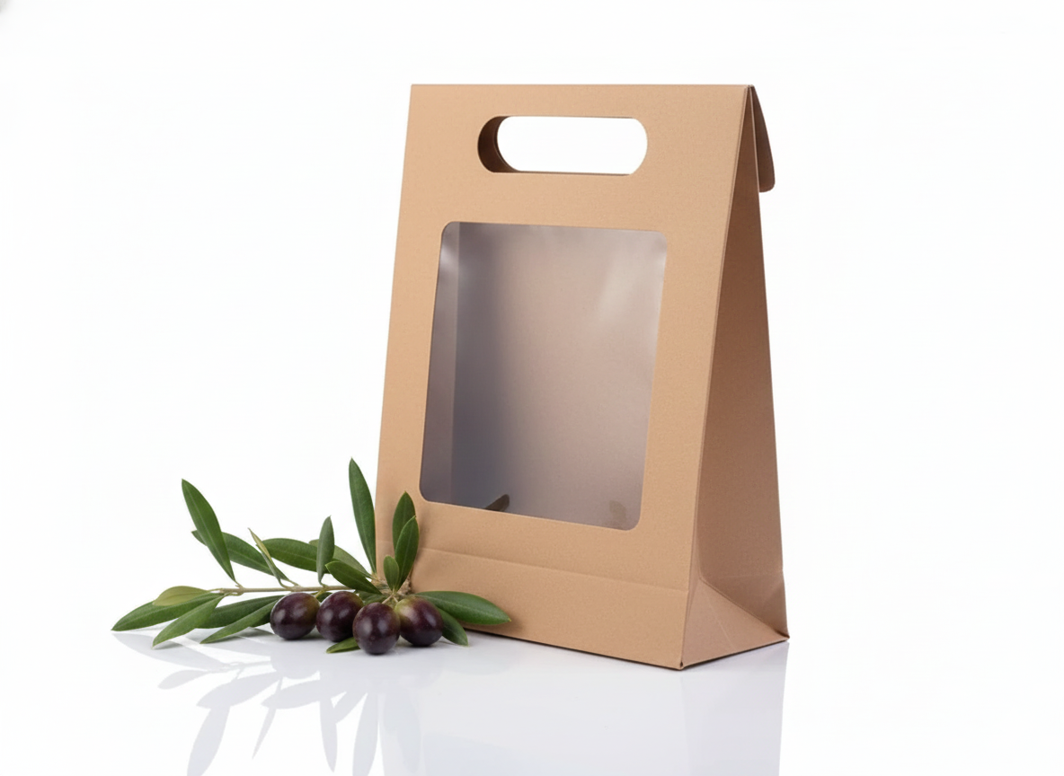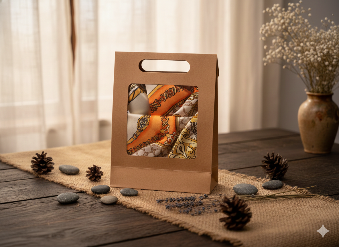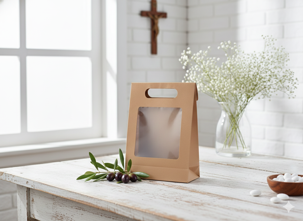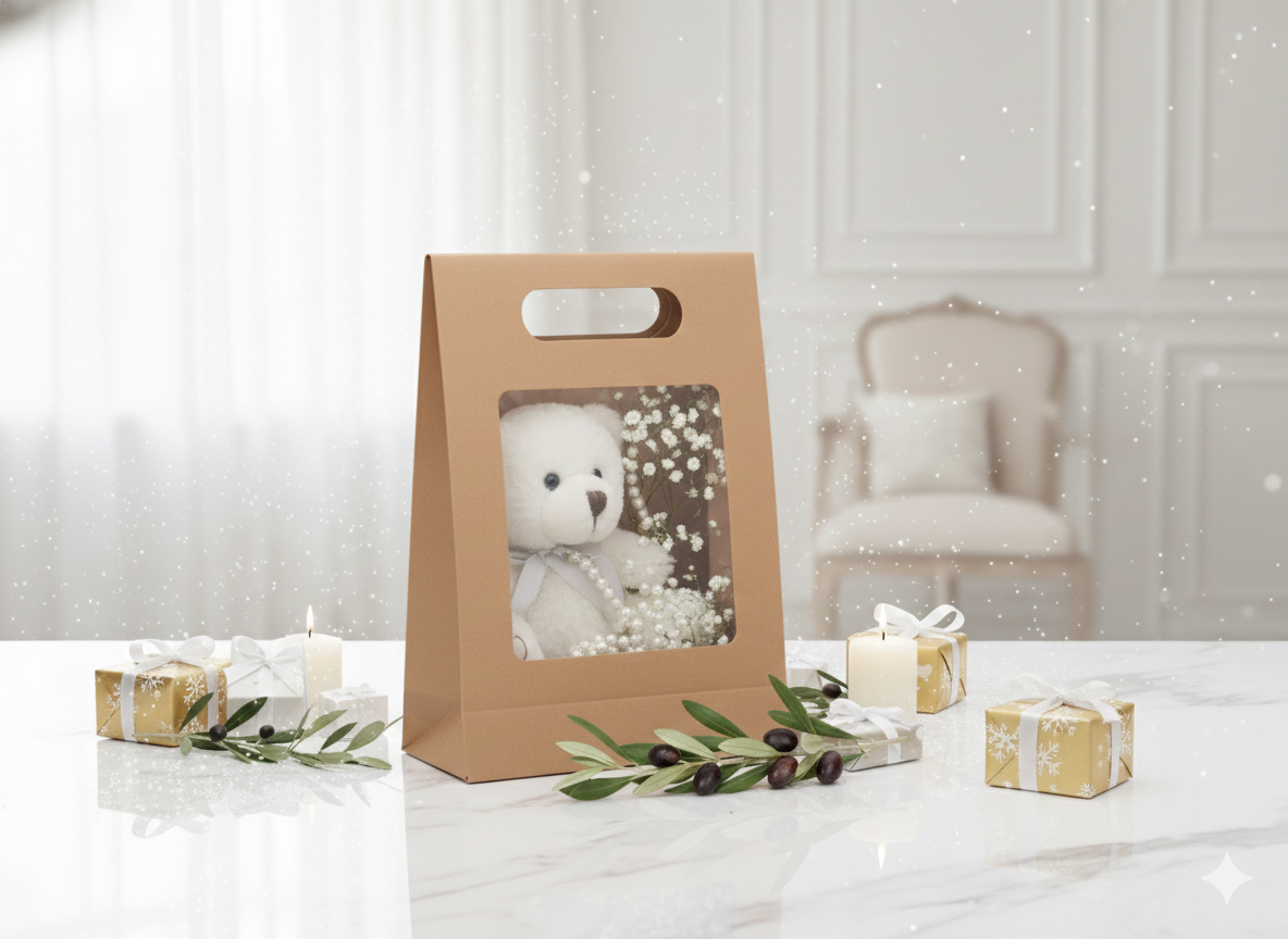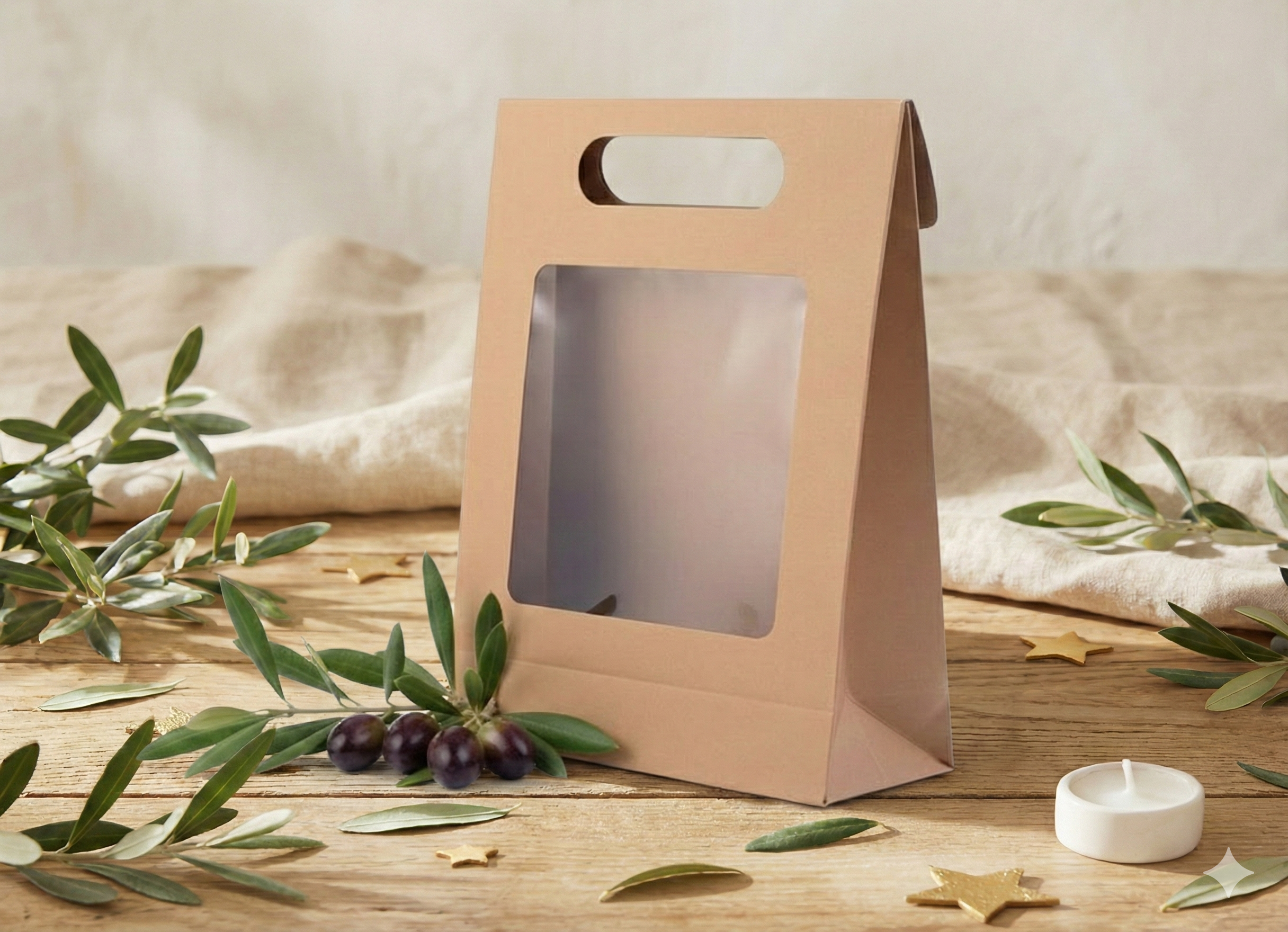 Elegancka torebka upominkowa EKO z kraftowego papieru, wyposażona w okienko prezentacyjne i wygodne wycięte ucho. Mocny papier, wzmocnione dno i zapięcie na rzep sprawiają, że to idealne opakowanie na świeczki, kosmetyki, dekoracje i prezenty handmade.