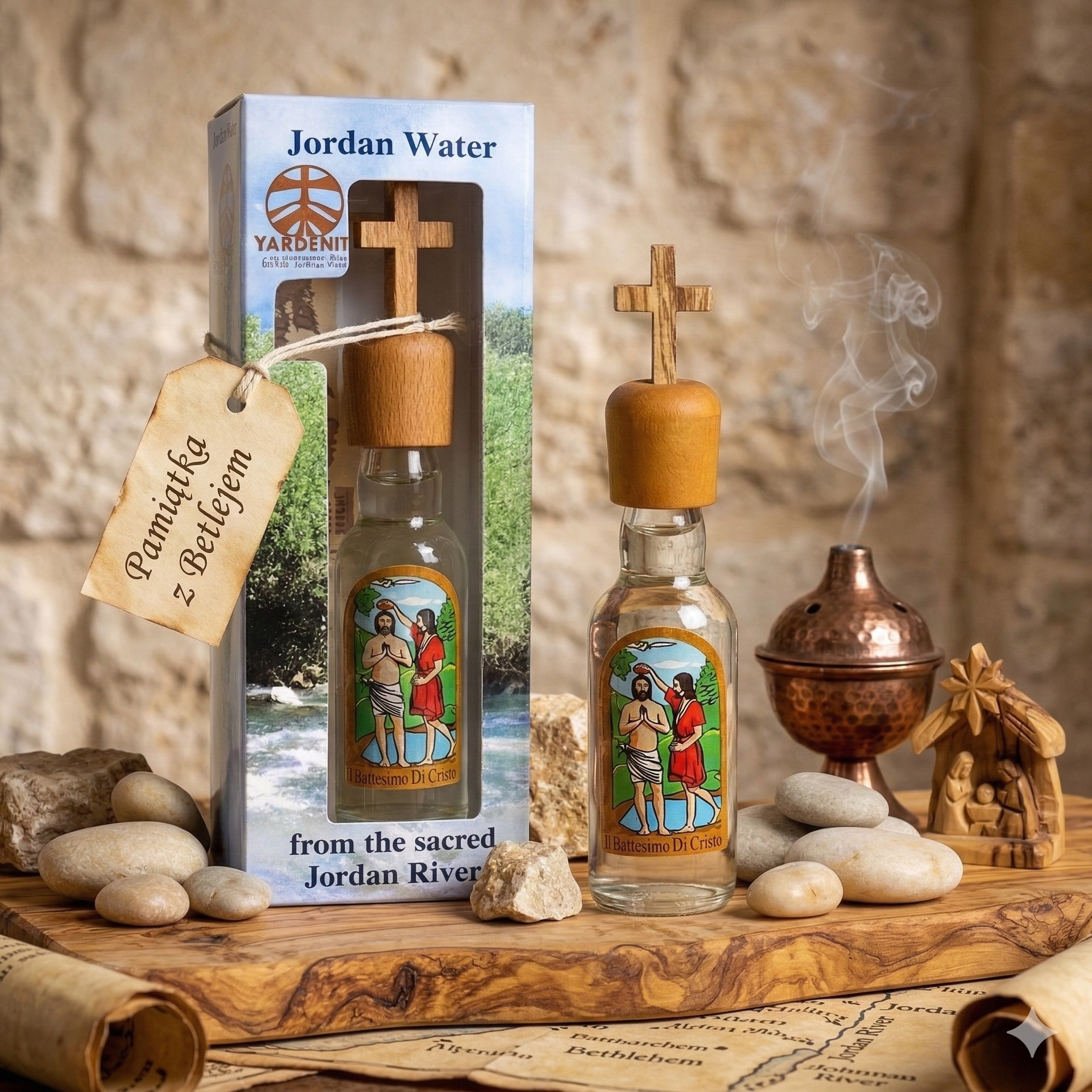 - autentyczna woda z rzeki Jordan,
