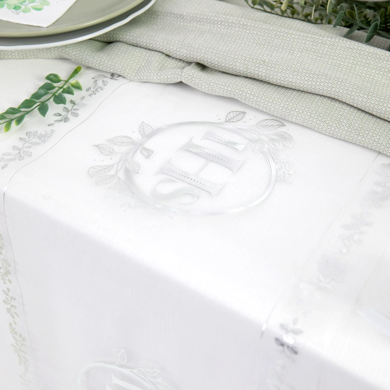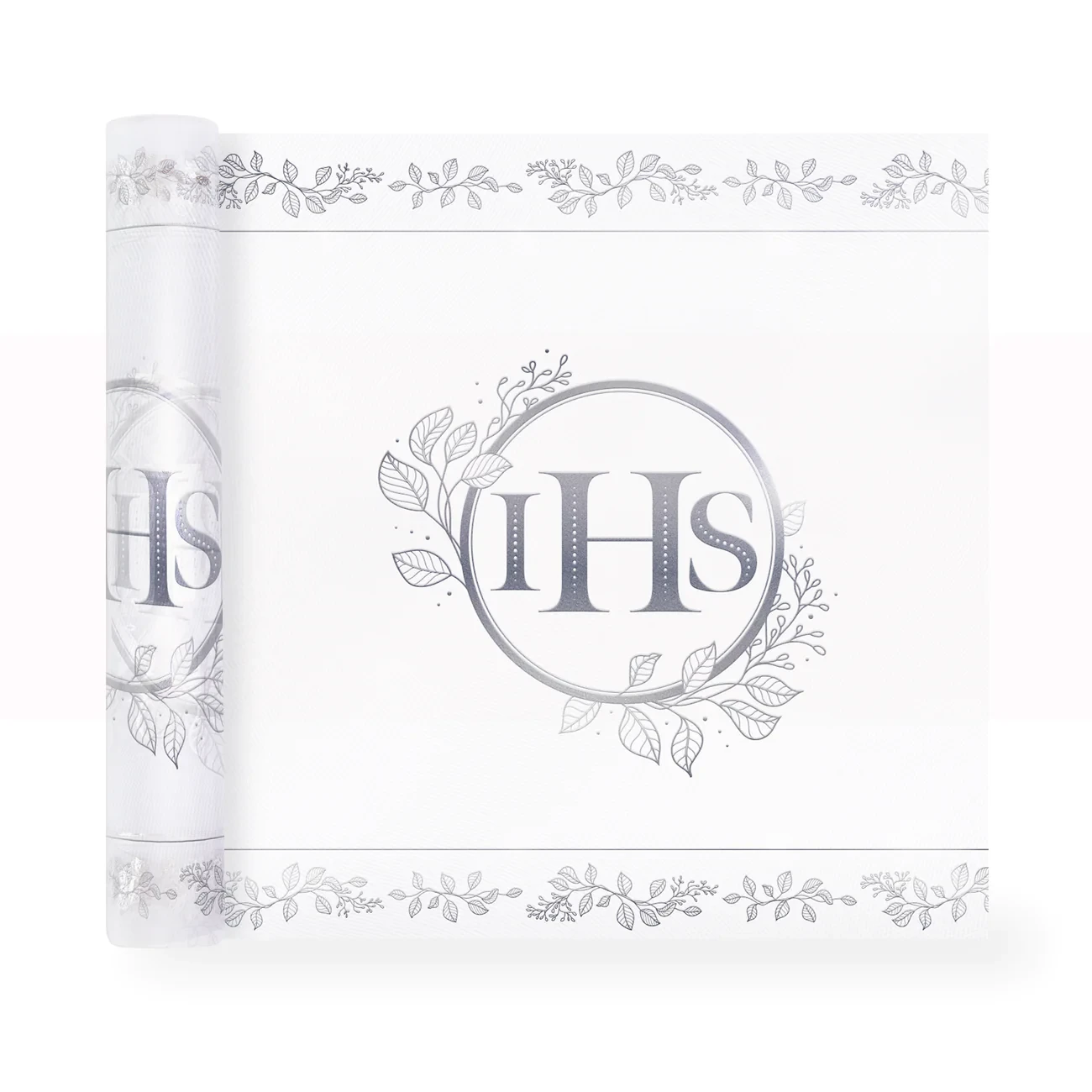 Elegancki bieżnik komunijny z motywem srebrnego eukaliptusa oraz symbolem IHS. Idealny do dekoracji stołu podczas Pierwszej Komunii Świętej. Rolka 5 m × 30 cm — subtelna, świeża i nowoczesna oprawa przyjęcia.