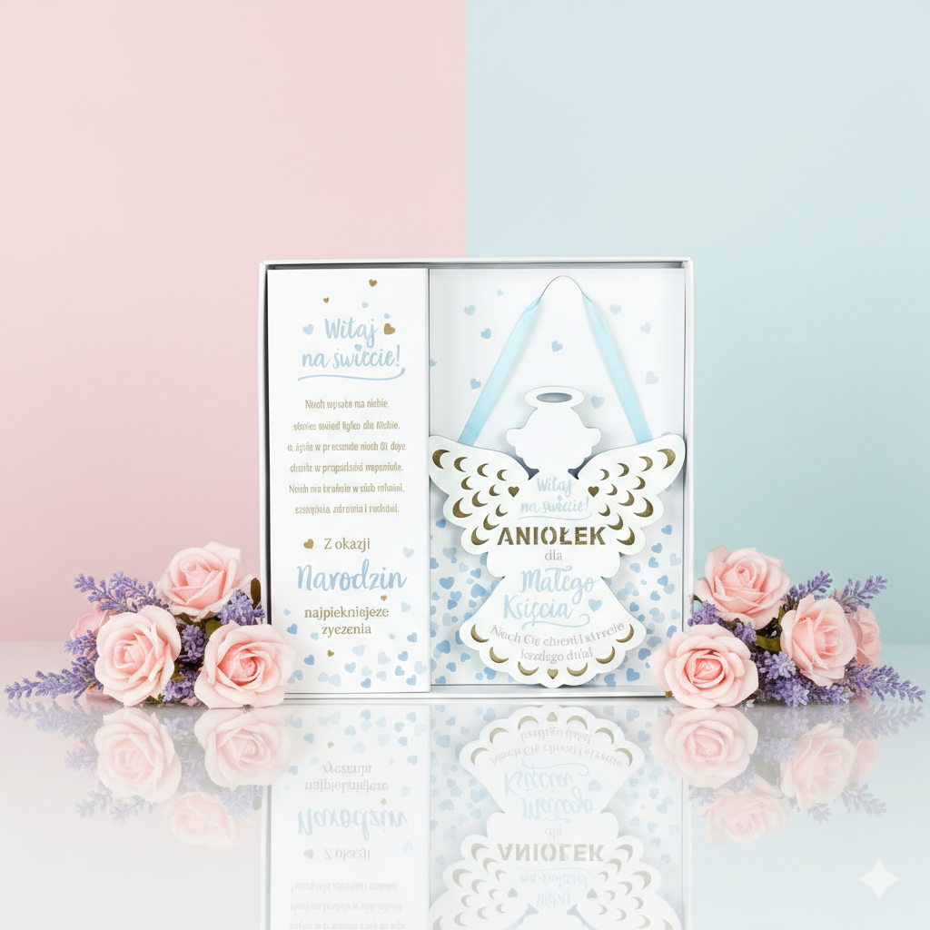 Elegancka zawieszka Anioł „Narodziny Księcia” to wzruszająca pamiątka narodzin chłopca z lustrzanymi zdobieniami i sentencją: