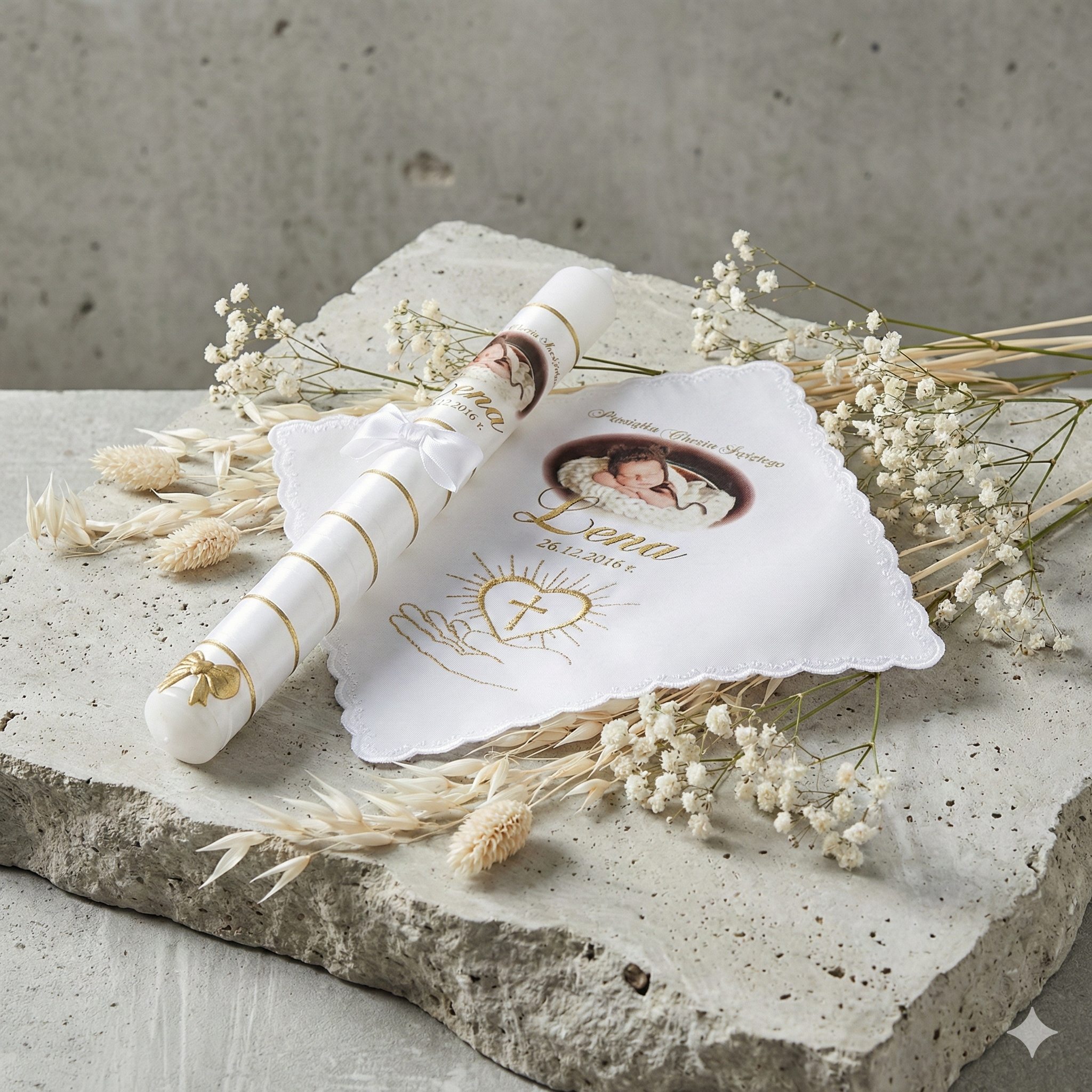 Zestaw do Chrztu ze zdjęciem dziecka został stworzony po to, aby zachować wspomnienie tej chwili w pięknej, osobistej formie. Świeca, jako symbol światła Chrystusa, oraz delikatna szatka z możliwością personalizacji tworzą harmonijny komplet, który łączy tradycję z nowoczesną estetyką.